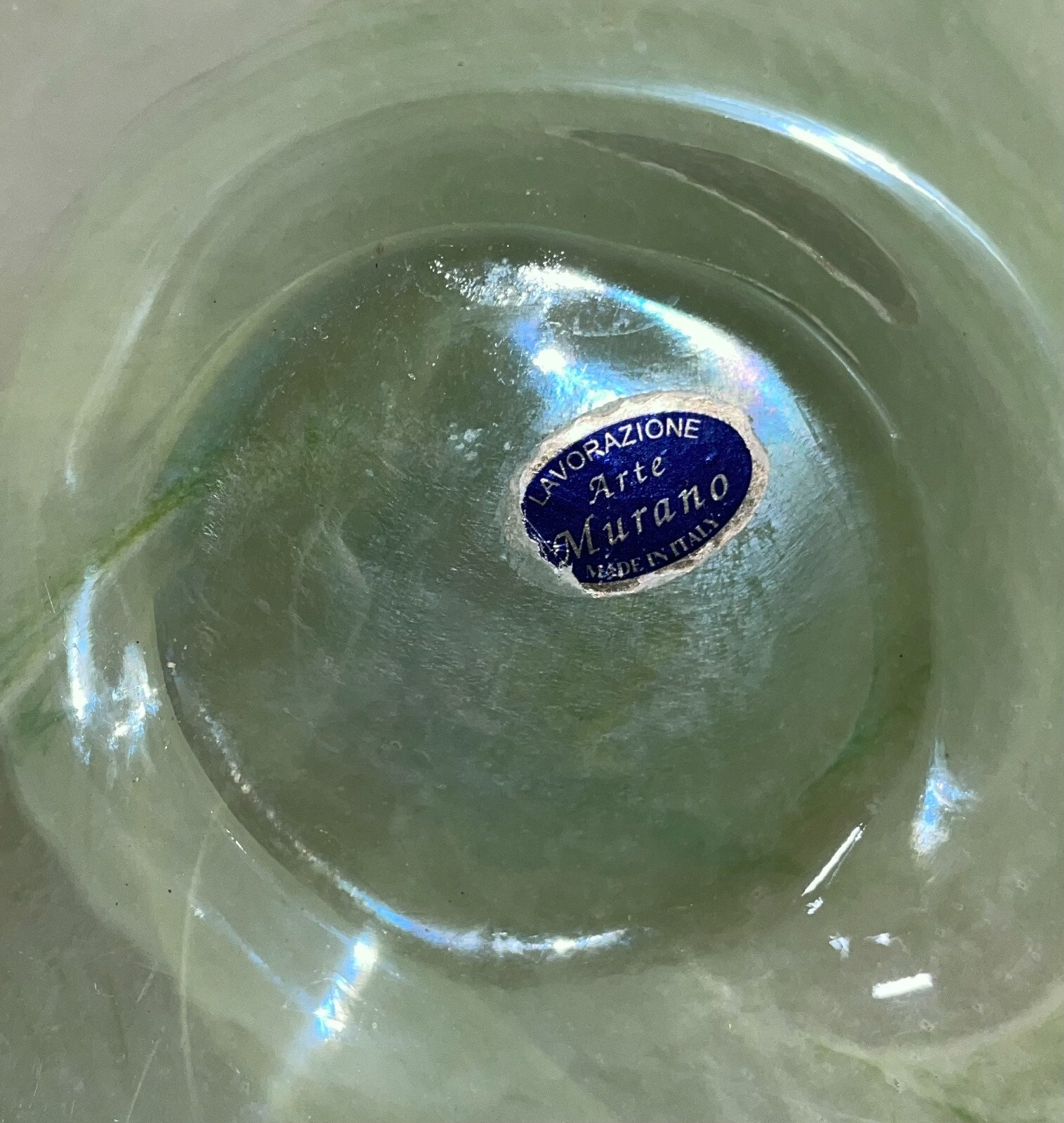 LAVORAZIONE ARTE MURANO Heart Shaped Green To Clear Decorative Bowl Sticker has aged a little, see photos. This unique bowl is a beautiful representation of Lavorazione Arte Murano's art glass production style. Hand-blown in Italy, the bowl features a vintage pattern in a stunning clear to green. Its heart-shaped design adds an elegant touch to any table setting, making it a perfect decorative piece. Made from high-quality glass, this bowl is a true artisanal treasure that showcases the craftsmanship of Murano glassmakers. Measurements are 3 inches high x 11 1/2 inches across widest area. Base measures 3 inches edge to edge. Ruffled edge rim crimped like a pie crust. Damp cloth only, Do not put in dishwasher. LOOKING FOR LESS EXPENSIVE SHIPPING? Click on "See details" next to Expedited Shipping Fee above to see other shipping options. eBay calculates the shipping fee based on package size, weight and type of shipping you select. ATTENTION REGARDING SHIPPING !! Shipping costs are expensive. If you buy 2 or more items totaling $50 or more , I will handle the shipping cost (ground) anywhere in the continental United States. Items cannot be listed as having to be shipped alone due to SPECIAL PACKING NEEDS . eBay does not adjust the shipping cost removal on invoice automatically. I can do it on the final invoice after you have items in shopping basket, before you pay. If eBay forces payment before that, you will receive a refund of shipping cost. The free shipping offer does not apply to Priority or Expedited shipping.