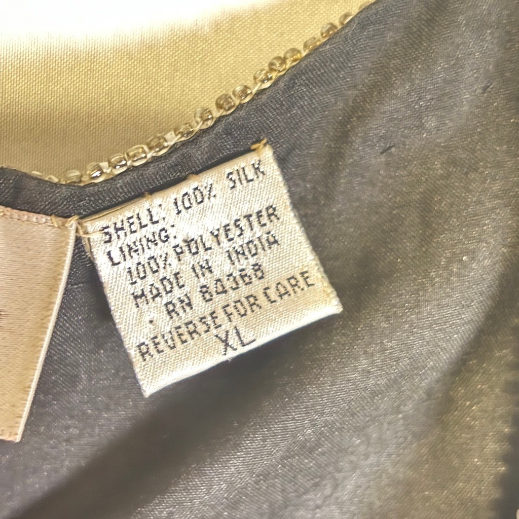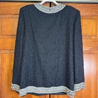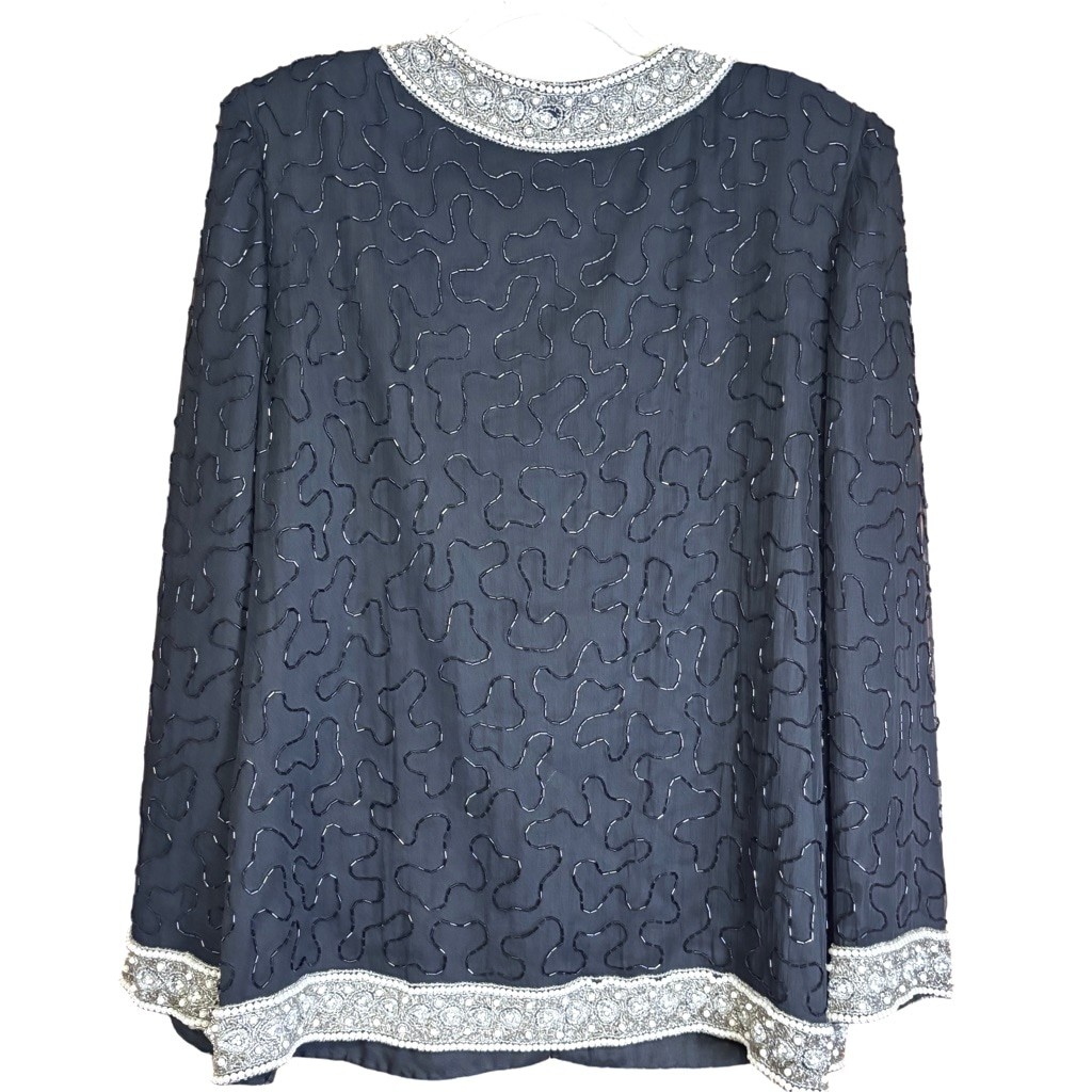 Stunning vintage Lawrence Kazar New York hand-embellished beaded jacket in Women’s XL. Heavily detailed with black bugle bead squiggle embroidery and ornate silver + pearl beadwork along the neckline, front opening, cuffs, and hem. Shell is 100% silk; fully lined. This is a true vintage evening/holiday statement piece with exquisite craftsmanship. Condition (please read): Pre-owned with typical vintage bead loss. Flaws shown clearly in photos: • Missing beads on the front trim (see close-up where pointing) • Missing beads on the back panel (close-up provided) • A few loose beads in other areas • No major patches missing and no structural damage Overall, still absolutely gorgeous, sparkly, and wearable — priced accordingly. Details: • Brand: Lawrence Kazar New York • Size: XL • Shell: 100% Silk • Lining: 100% Polyester • Made in India • Open front • Pearl + sequin + bugle bead embellishment • Fully lined Measurements (flat): • Pit to Pit: 23 in • Length: 27 in • Sleeve: (Add if you want) Perfect for holiday parties, formal events, cocktail attire, mother-of-the-bride, stage wear, collectors, and anyone who loves true vintage beaded pieces. Smoke-free home. Ships carefully packed. lawrencekazar, beadedsilkjacket, vintageeveningwear, formaljacket, sequinjacket, pearltrim, silkbeaded, holidaypartyoutfit, motherofthebride, cocktailwear, 80svintage, 90svintage, blackandsilver, statementjacket, vintageglam