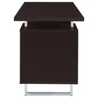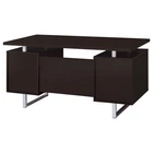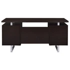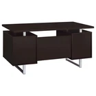 Enjoy an intriguing architectural design in this office desk. A floating top creates a visually enticing effect and a completely different look. Finished in cappuccino, it flatters surrounding decor and delivers a dramatic touch. Store essentials in a cabinet and drawer, and use a file cabinet to organize papers. Contrasting silver hardware and steel legs plays up the contemporary flavor of this stylish desk. Features: Includes: One (1) computer desk Classy office desk in cappuccino finish Clean metal base in silver finish Simple desk includes one (1) storage cabinet, one (1) storage drawer, and one (1) file cabinet File cabinet holds both legal and letter size files Metal, MDF, particle board, and laminate construction Specifications: Product Dimensions: 30" H x 60" W x 23.5" D Product Weight: 94.6 lbs Assembly Required: Yes Warranty: One (1) year limited manufacturer warranty