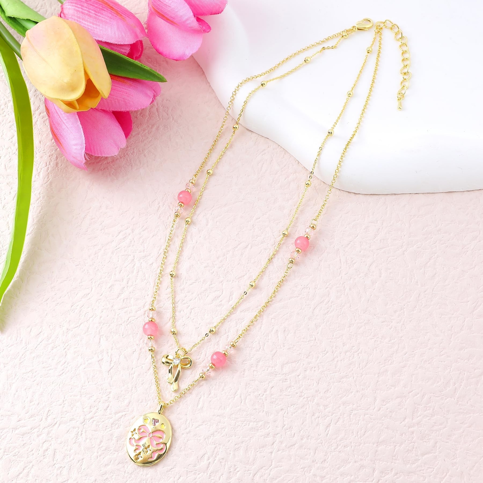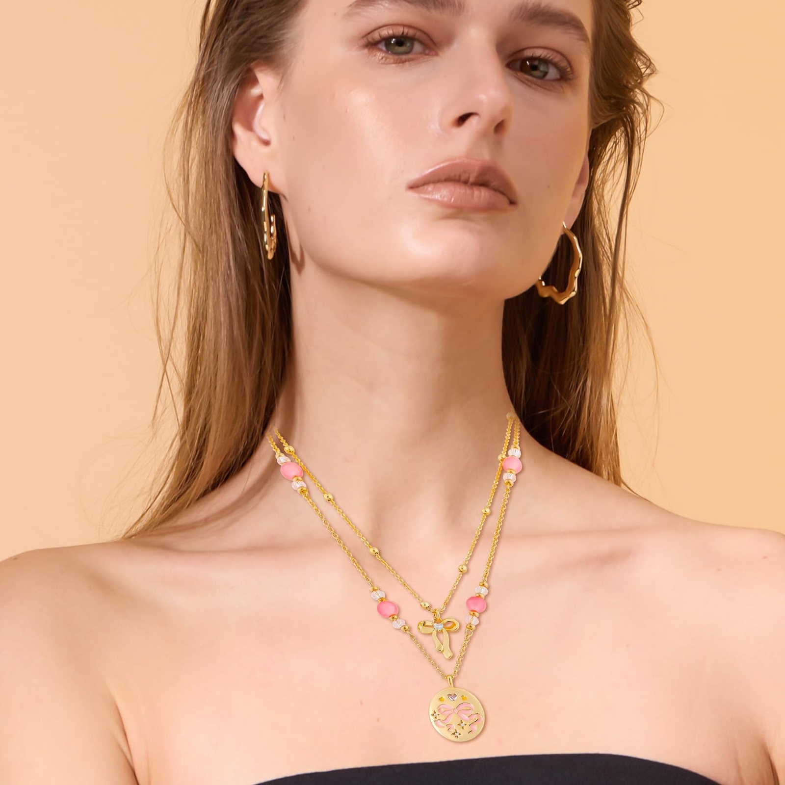 Layered Gold Necklace for Women 14K Gold Plated Cubic Zirconia Lock Key Love Heart Cherry Bow Butterfly Flower Pendant Necklace Pearl Cute Glass Beads Choker Necklace Adjustable Trendy Jewelry Gift Product Details Style: Bow Brand: MOONWALTZ MPN: Does not apply UPC: Does not apply EAN: Does not apply Date First Available : March 7, 2025 Brand, Seller, or Collection Name: MOONWALTZ Metal stamp: 14k Metal: Brass Material: Brass Gem Type: No Gemstone Clasp: Lobster