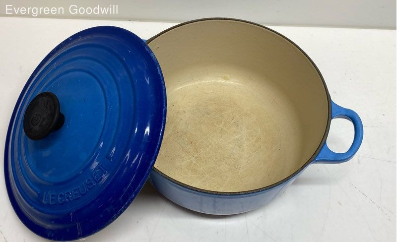 Le Creuset/ Le Creuset/ Blue Pot Iron Blue Iron Le Creuset/ Brand: Le Creuset/ Blue Pot Iron Style: Le Creuset/ Type: Le Creuset/ Color: Blue Material: Iron Condition: Good - shows some sign of wear Evergreen Goodwill helps people get jobs across Northwest Washington by offering high-quality free job training, education and job placement. We empower individuals to overcome barriers to working by providing comprehensive support and connecting them with life-changing job opportunities, ensuring they are career-ready and can support themselves and their families. ***Disclaimer*** All items were donated to Evergreen Goodwill of Northwest Washington with no history or provenance. The auction is for all items pictured. Items may need servicing and/or benefit from a cleaning upon arrival. Please see photos for additional details and feel free to ask questions. PAYMENTS Please note that your entire order will be canceled by eBay if the oldest item exceeds 7 days without payment. Once an order is canceled, we are unable to re-invoice and the item will be relisted. For a combined shipping invoice, please send us one request within 5 days of winning the first item to avoid cancelation of your entire order. Once a combined invoice has been sent, we are unable to add additional items to the invoice. SHIPPING Local pickup only available to items listed as Local Pickup at this time. Interntaional shipping is not available at this time. We offer combined shipping as long as items will ship safely together. Auctions must end within 5 days of each other to be eligible for combined shipping. Please hold off on payment until all auctions have ended then proceed to checkout. Please do not pay for any items individually if you wish to have them combined - they must be paid at the same time. Items listed for flat-rate shipping are not eligible for combined shipping. PO Box addresses will require USPS shipments as FedEx Ground will not deliver. If FedEx is selected we may need to invoice for additional shipping costs.