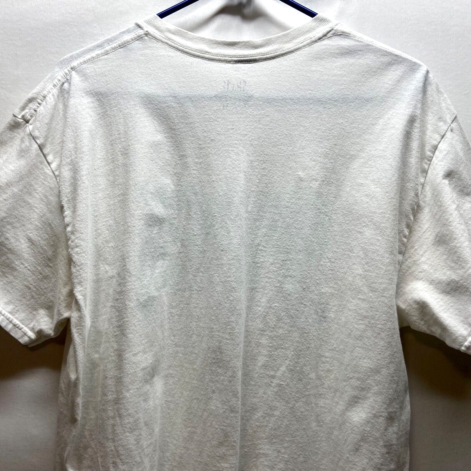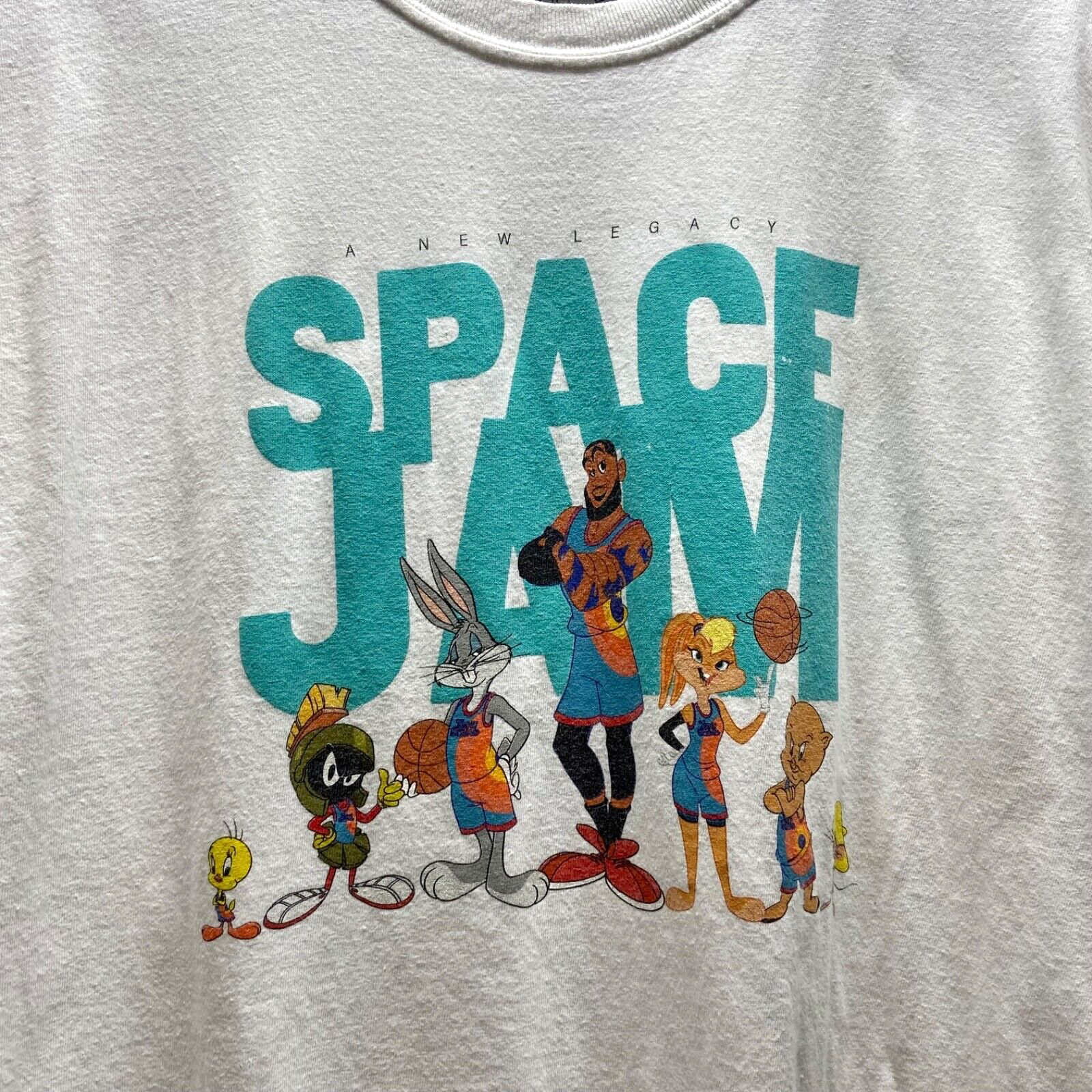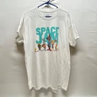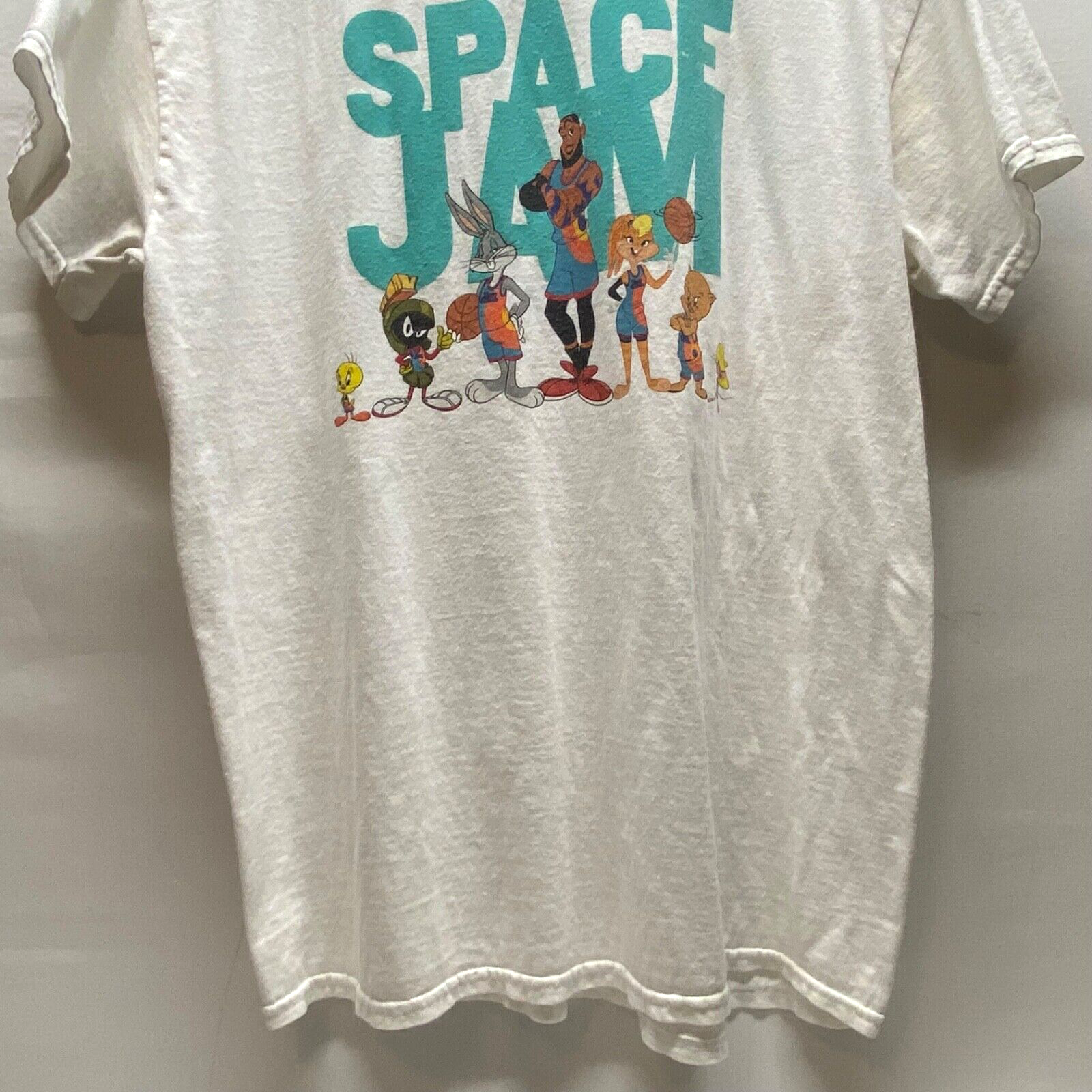 This Space Jam LeBron James shirt is an adult large white tee featuring a graphic logo from the movie "A New Legacy." Made of cotton knit fabric with a crew neck and short sleeves, this regular fit t-shirt is machine washable and tagless for easy care. It showcases various characters like Speedy Gonzales, Bugs Bunny, Tweety Bird, Daffy Duck, and LeBron James, perfect for fans of the 90s movie franchise. The measurements of this shirt are Chest 40 inches and the Length is 29 1/2 inches. Same Day Shipping! All pre-owned clothing items have been laundered, and all new with tags garments have been steam cleaned per policy. Thank you for shopping TKO Specialties