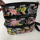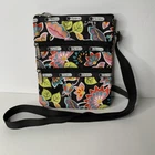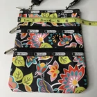 This LeSportSac Floral Crossbody Bag in a colorful multicolor exterior is a small rectangular handbag featuring a floral pattern. It has a three zip closure, black crossbody strap handle, and silver hardware accents. The bag is lightweight and includes multiple pockets, making it suitable for travel, casual outings, or workwear. The interior is lined with black nylon, and the model is the LeSportSac Kasey.