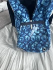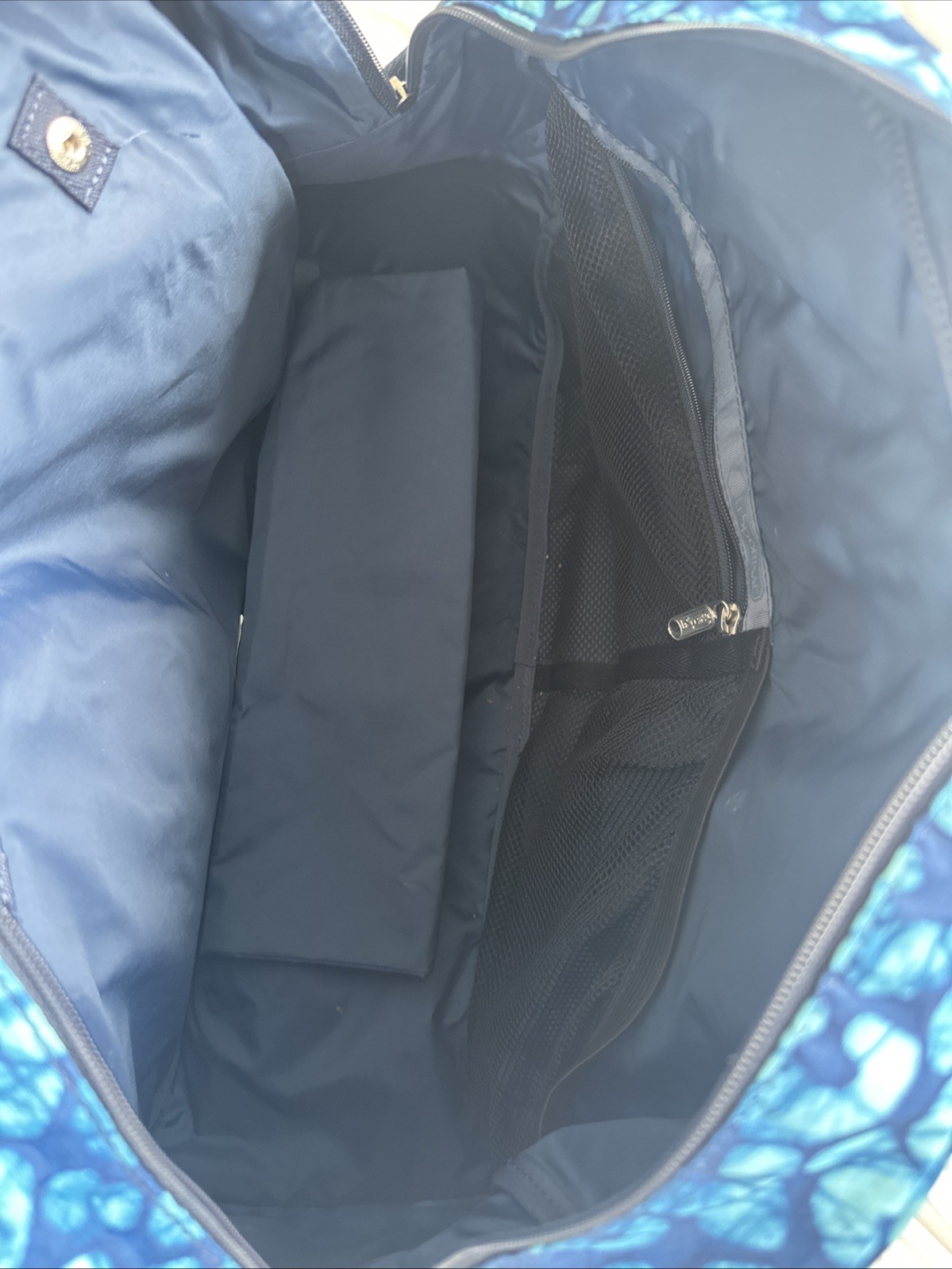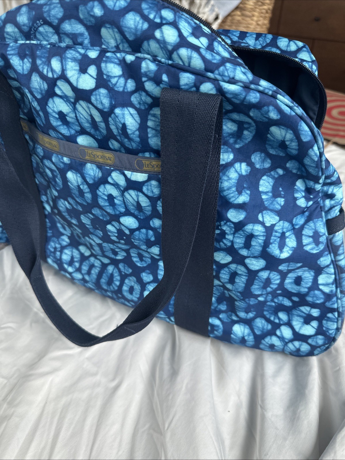 The LeSportsac Travel Bag Carry On Duffle in Blue is a large nylon duffle bag designed for travel, featuring a floral pattern and silver and blue hardware accents. The bag has a zip closure, polyester lining, and nylon handle/strap material. It also includes pockets for added organization and is branded by Le SportSac. Perfect for women on the go, this stylish and practical duffle is a great choice for any travel occasion. Perfect work weekend trips 18x11x6 inches