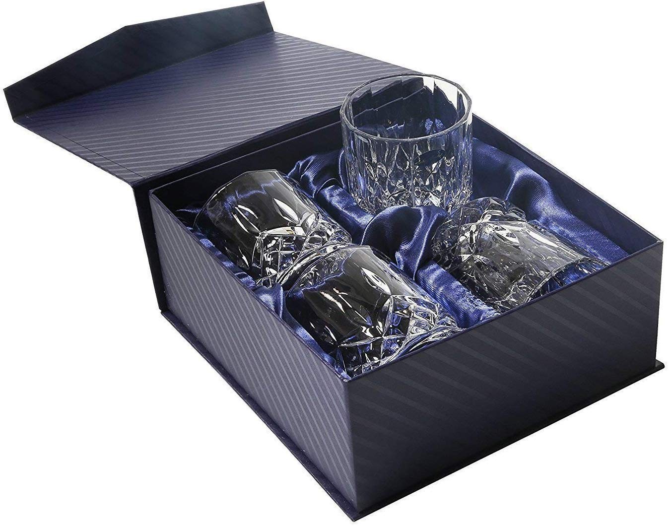 With a cut that is as easy on the eye as it is to grip, these glasses are the perfect companion to your evening. Crafted of quality lead free crystal material Perfect for serving scotch, whiskey or mixed drinks Size: 3.24" x 3.74" high, 9 ounce capacity Comes in inscribed gift box An exceptional value and an excellent gift for any occasion