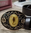 A Western-style unisex leather belt in brown, size 34, featuring a scorpion buckle with horse stamped embellishments and a flower themed buckle design, featuring a real scorpion encased in resin. This belt is perfect for those interested in a cowboy or western-inspired look.