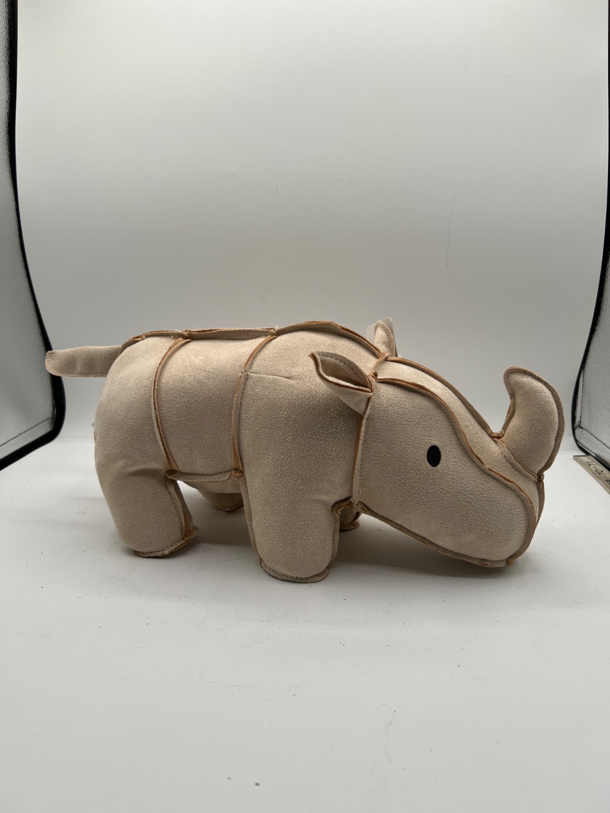The Leather Rhino Plush Toy is a medium-sized stuffed animal with a beige color, perfect for celebrating any occasion. This unique toy features 12” weighted feet, giving it a realistic feel and adding to the overall charm of the plush. It is a great way to add a touch of fun and whimsy to any collection of stuffed animals or toys.