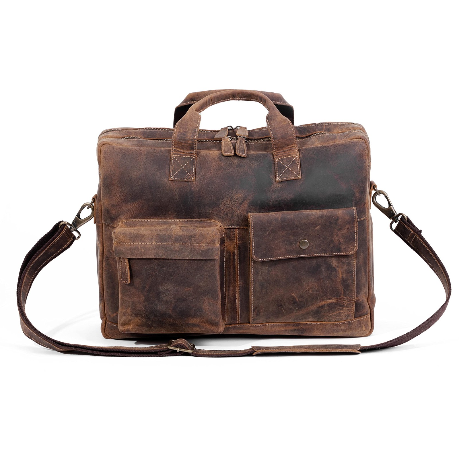 messenger briefcase for men laptop shoulder 16-inch leather laptop for men and leather office leather shoulder handmade leather messenger bag for men leather satchel shoulder bag for men 's laptop bag leather briefcase best handmade bag distressed best gifts for men computer bag leather Christmas valentine anniversary gifts for men and Premium Buffalo Leather & YKK Metal Zippers: Crafted from premium top-grain water buffalo leather by experienced craftsmen. All metal zippers used on this bag are from the renowned YKK brand, known for their durability and reliability. Trolley : Equipped with a convenient trolley strap at the back, allowing you to easily attach the bag to your suitcase for hassle-travel at airports. Sleek & Multipurpose Design: With dimensions of 16" (W) x 13" (H) x 5" (D), this bag can accommodate laptops up to 15.5 inches while maintaining a sleek, non-bulky look. It can be used as a briefcase, laptop messenger bag, or office satchel bag. Multiple Storage Sections: Features 2 large zippered compartments—with a padded section for laptops and valuables, and another for documents, journals, and files. Includes 2 side zip pockets for smaller items like wallets or diaries, as well as designated compartments for cards, pens, and mobile devices. Additionally, there’s a rear zip pocket and front pockets (with zip and button closures) for easy access to keys and frequently used items. Perfect Gift with : A great gift for any occasion—Christmas, Valentine’s Day, birthdays, or anniversaries. This bag comes with a -year , ensuring peace of mind..