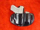 Black pressure molded right hand leather holster and extra magazine holder fits the Glock 42 with Crimson Trace laser . Sweat pad on back of holster provides protection between skin and gun. .Extra magazine readily available for when one magazine is not enough. Made in U.S.A. with heavy American leather in our shop. Left hand or brown leather available by request leave note to seller when you order. . FAKE gun & clip are not for sale. Shipping may be up to 7 days by USPS First class mail for quick delivery and tracking.