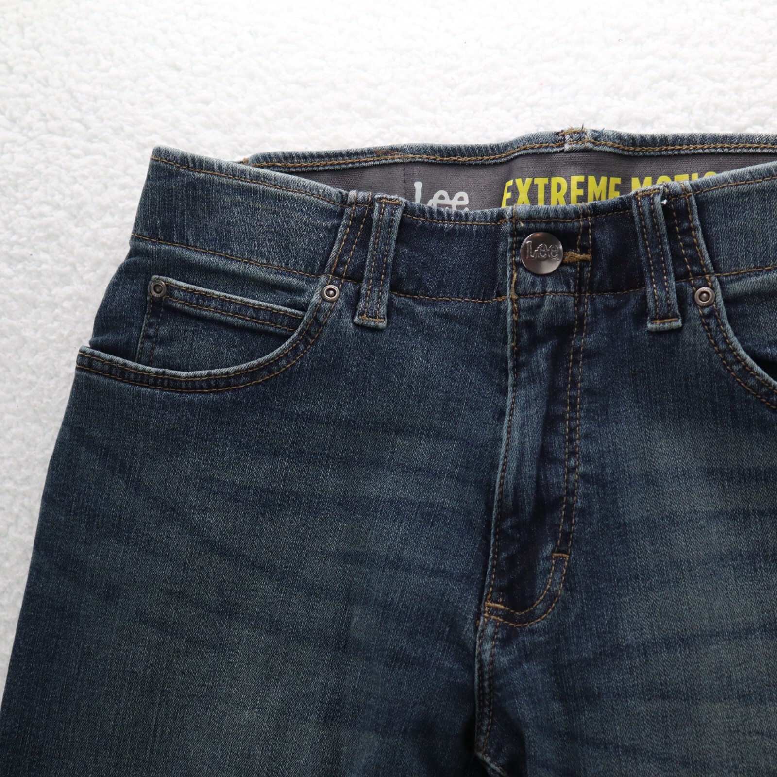 Lee Jeans Men 32X32 Blue Extreme Motion Straight Fit Tapered Leg Denim Dark Wash This item is in pre-owned condition and therefore may show signs of previous use, such as small stains, holes, or other wear. Please view all of the items photos as any defects will be documented there. Sizing in the title and item specifics are based on what the tag says. Measurements can be seen in the photos.