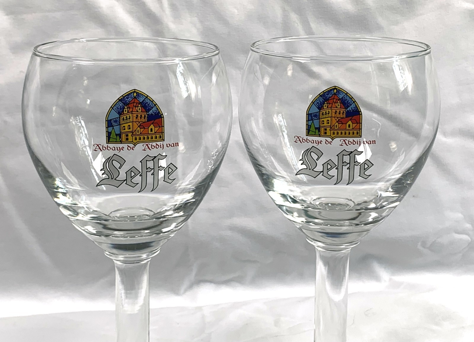 2 Preowned Leffe beer glass Measures 7.5 " tall and holds 16 oz Colorful logo No chips or cracks Look hardly used if at all