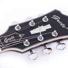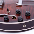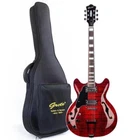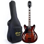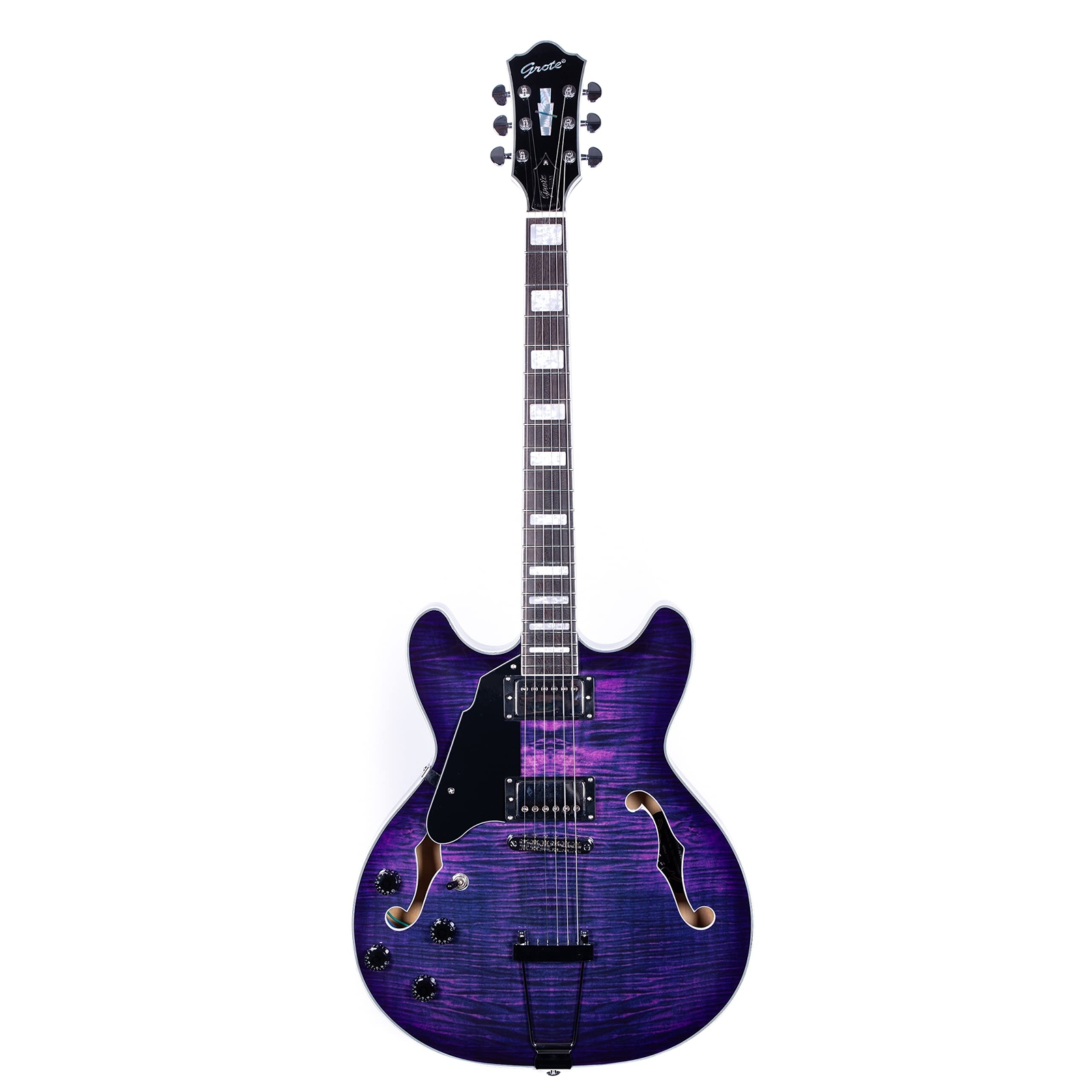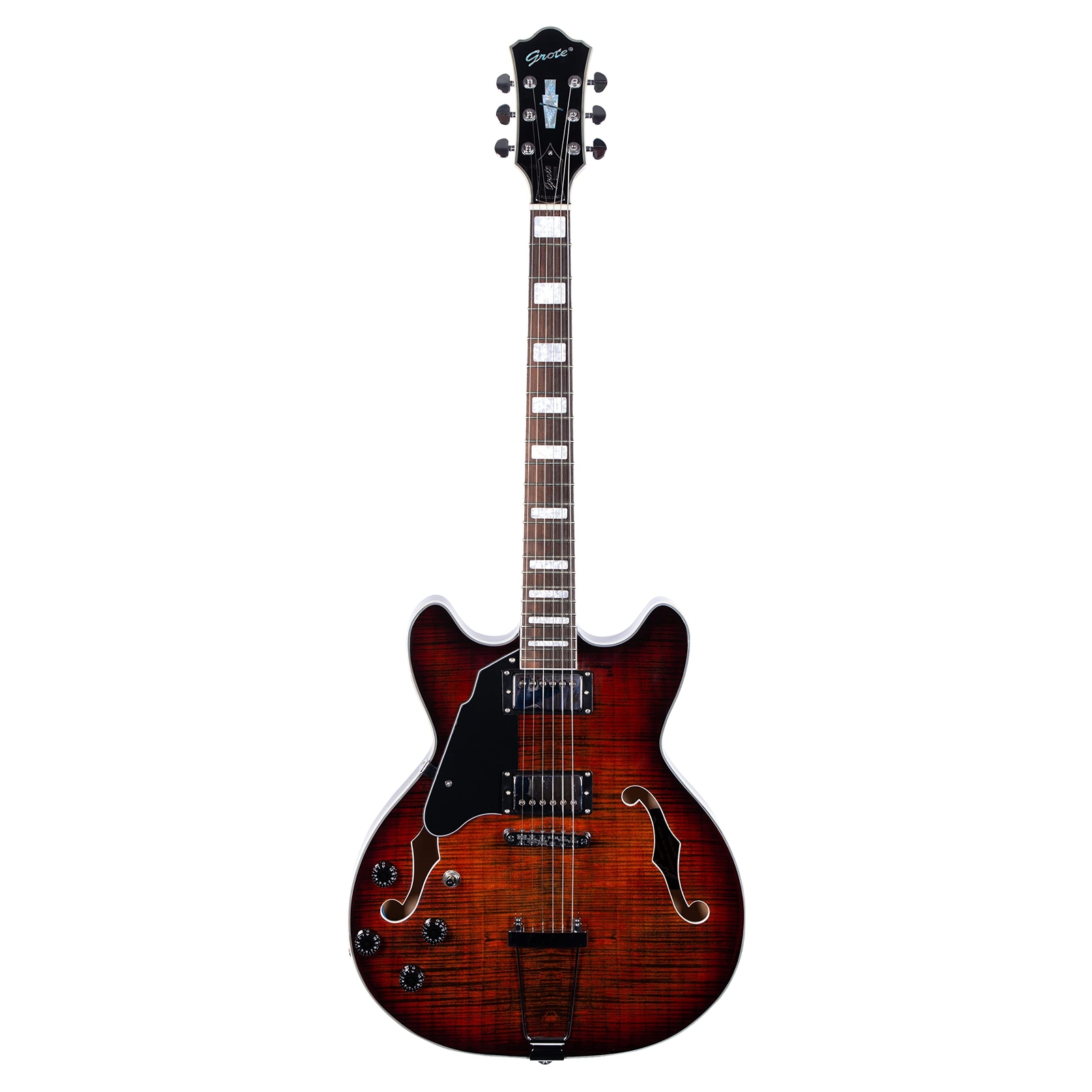 The perfect combination of unique style and left-handed design with our reverse electric guitar. The semi-hollow body made of high-quality basswood produces a warm and rich tone with excellent sustain, while the stunning maple printed design adds a touch of personality and style.Left-handed players can now enjoy a unique and inspiring playing experience with a guitar that is specifically designed for their needs. The Grote laser anti-counterfeiting label that you are getting an authentic and high-quality instrument, while the metal truss rod cover provides extra durability and protection. Designed for powerful, high-gain tones and a thicker, fuller sound, our humbucker pickups offer a level of versatility that can't be matched. Whether you're playing heavy metal, classic rock, or blues, our guitar will provide a dynamic range of sound that will have you shredding like a pro. The rosewood fingerboard on this electric guitar adds a touch of elegance and warmth to its already exceptional sound and playability. With its smooth surface and rich, resonant tone.