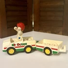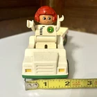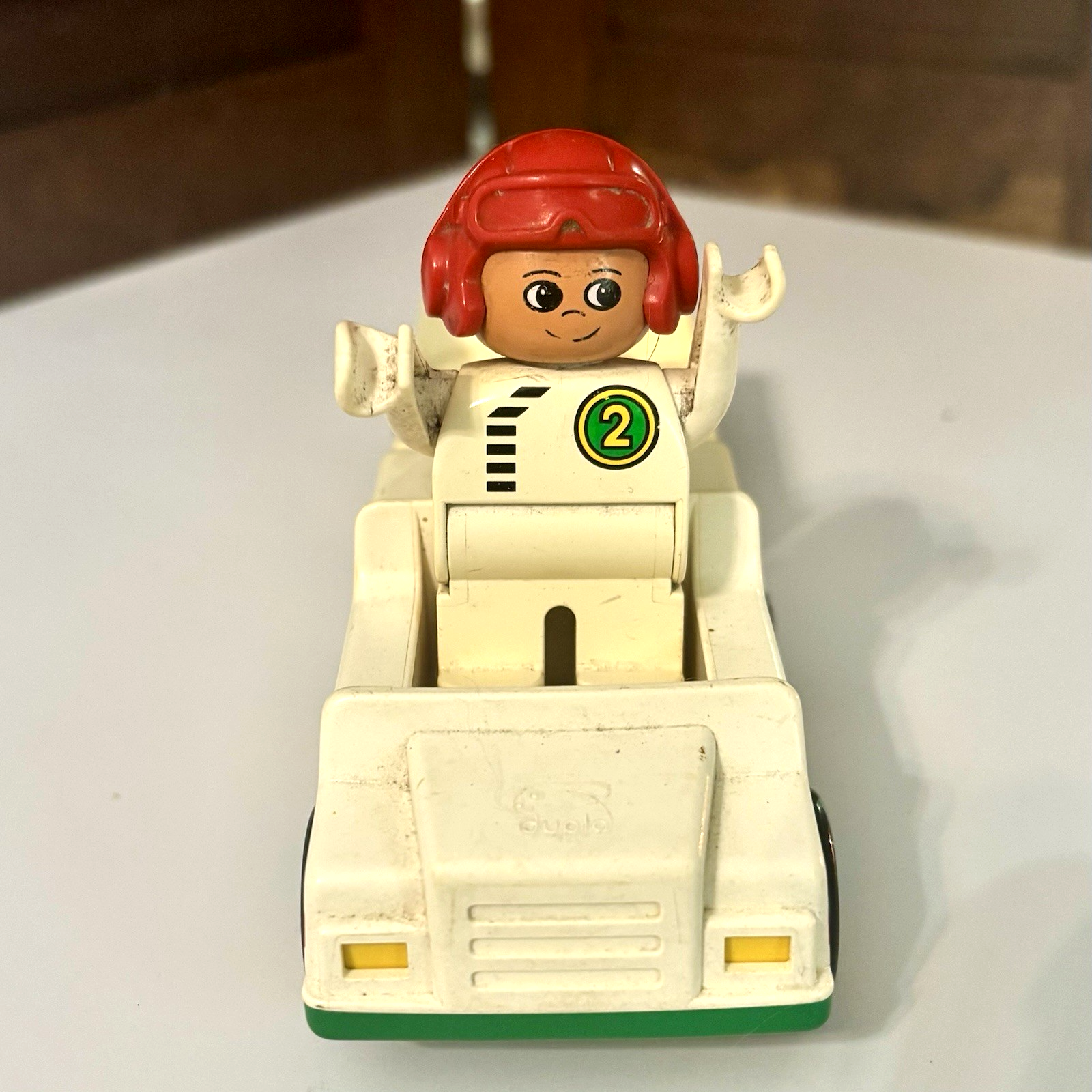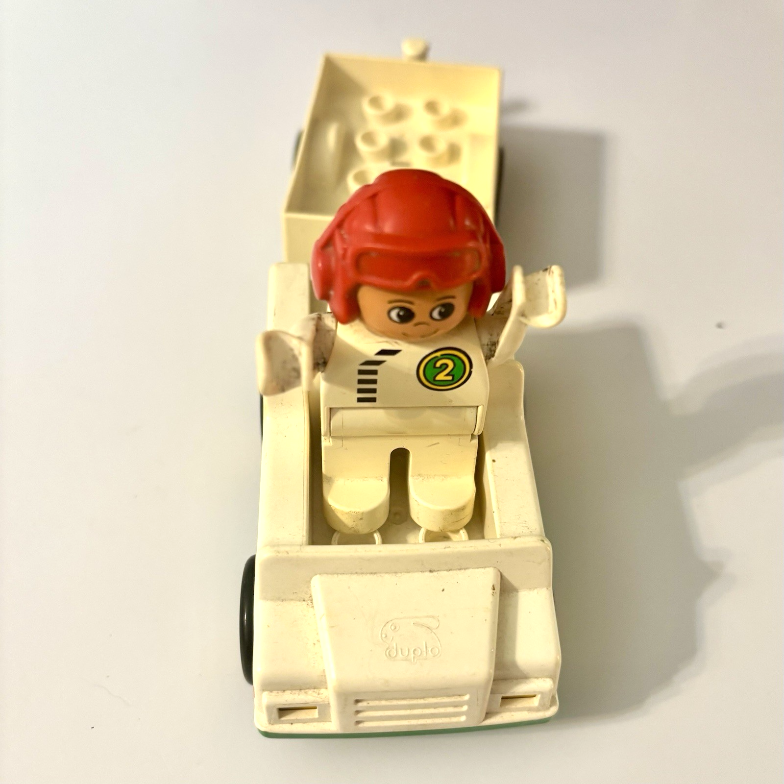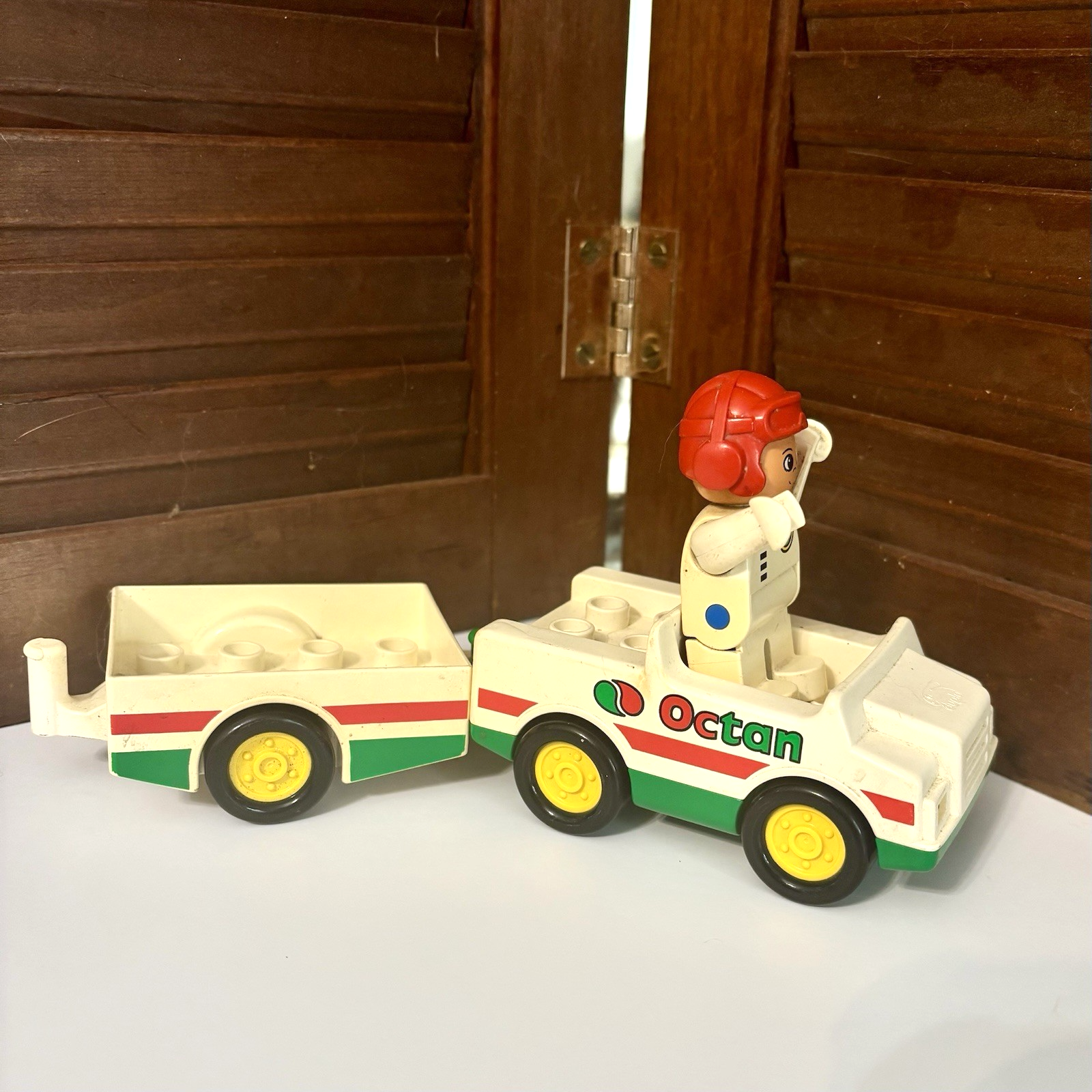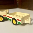 This Lego Duplo set features a red and green pickup truck with a trailer and a fig driver. * The set contains 3 pieces and is made of durable plastic. * Age: 3+ * Size: The truck and driver are 2 inches wide, 8 inches long, and 3-3/4 inches high. * Condition: Great pre-owned, vintage condition, with a little wear and could use a scrub and shine.