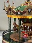 The Lemax Jungle Carousel Animated Action with Lights, Carnival Music, and a Whimsical Carnival Carousel design is a large, beautifully hand-painted Christmas Village display piece. This American-themed illuminated carousel features a 3D effect and comes boxed with a musical feature, making it an ideal addition to any room for adults who enjoy collecting holiday decor. With its bright red and multicolored whimsical design, this 2016 release from Lemax captures the enchantment of carnival rides in a charming and nostalgic way. Absolutely incredible detail and color ! Pristine condition & works perfectly. You can adjust the music from off to loud while all the lights stay on ! Just a beautiful piece! Comes with all original packaging including ac adapter .