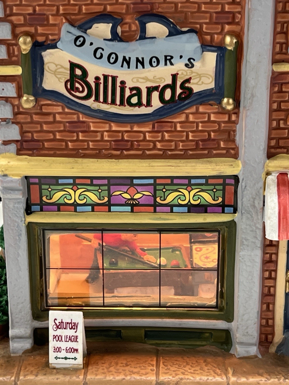 Add a touch of whimsy to your holiday display with this charming Lemax O’Connors Billiards piece from the 2012 collection. This asymmetrical, medium-sized porcelain house is beautifully painted with a delightful Billiards Hall pattern, complete with colorful characters and a festive atmosphere. The house measures 7 inches in length, 6-3/4 inches in height, and 5 inches in width, making it perfect for any room or village display. This original, retired piece is part of the Lemax O’Connor's Billiards collection and features a light and sign that add to the overall charm of the house. The house is suitable for all occasions and is perfect for adults who love American-style decorations. Don't miss out on the chance to add this unique and rare piece to your collection. Absolutely incredible condition. Includes all original packaging including light & cord . Just a beautiful piece .