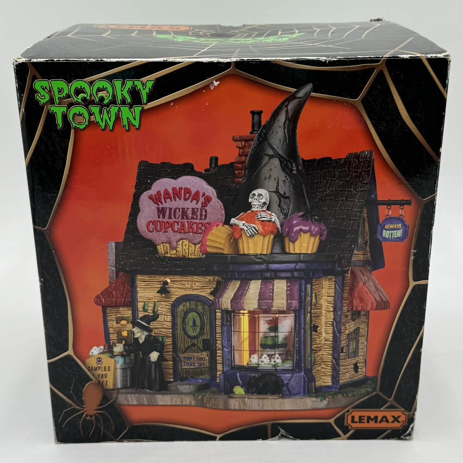 This Spooky Town cupcake set features Wanda's Wicked Cupcakes, perfect for Halloween celebrations. The set includes a box for easy gifting and storage. The multicolor designs and retired features make this a must-have for any Halloween collector. The Lemax brand is known for its quality and attention to detail, making this a great addition to any collection. The set is part of the Spooky Town collection and is perfect for seasonal and holiday decorations. This ceramic Halloween decoration has been glued back together multiple times. The item has also been chipped please look at all the pictures and video.