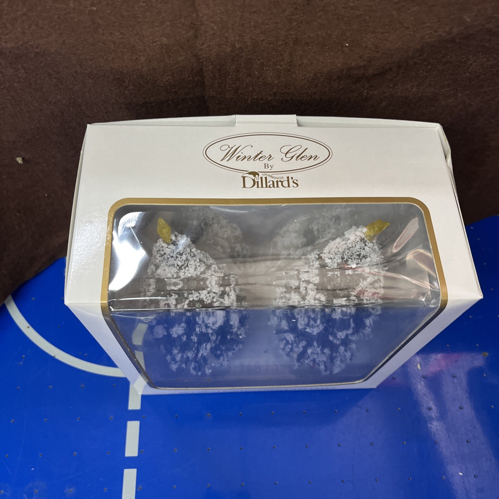 The Lemax Winter Glen by Dillard's Christmas "Set of 2 Lighted Christmas Trees" is a ceramic and porcelain collectible from the Winter Glen collection. These beautifully crafted Christmas trees are perfect for adding a touch of holiday cheer to your village display. With a festive hot cider subject, they are sure to bring warmth and charm to your winter scene. The lighted trees are a delightful addition to any Christmas decor, bringing a sense of magic and nostalgia to your home during the holiday season.