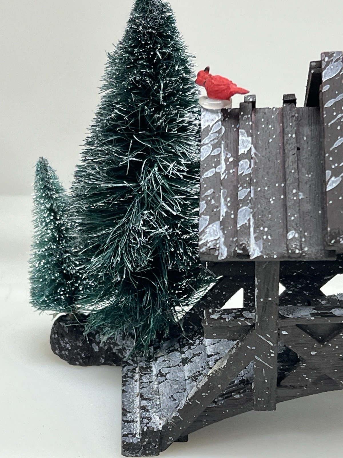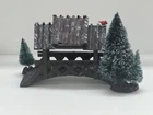 The Lemax Wooden Bridge With Trees from the Village Collection Holiday Scene 2001 is a small asymmetrical Christmas village accessory made of mixed materials. This rustic-style piece features a footbridge design with trees, perfect for adding a festive touch to any room during the holiday season. The Lemax Table Accent Foot Bridge comes boxed and is part of the Lemax brand's seasonal collection, making it a charming addition to any Christmas decor ensemble. Made of polystyrene.