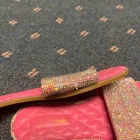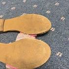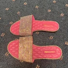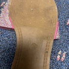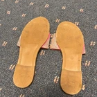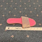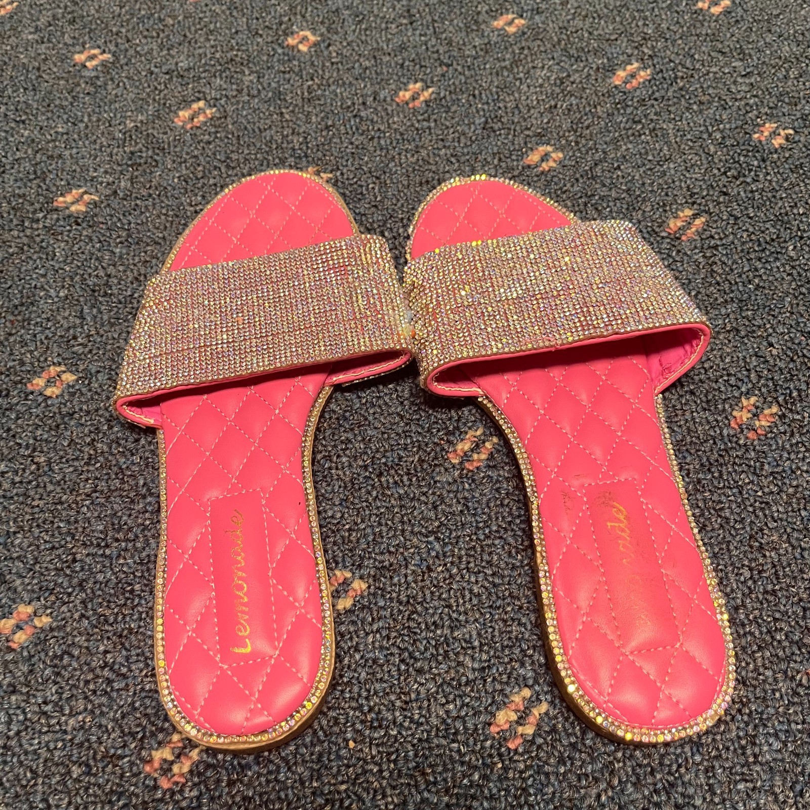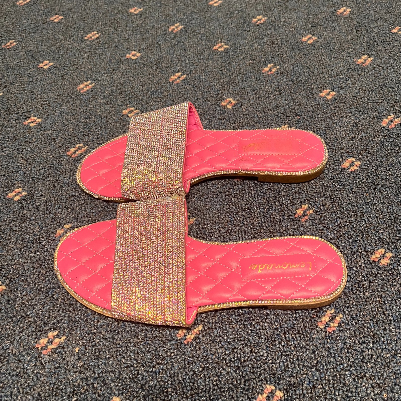 The product is a pair of Lemonade women's size 7.5 sandals in pink with rhinestone accents. These slip-on flats feature a quilted design and are perfect for casual occasions during the summer and spring seasons. The stylish and comfortable sandals are ideal for those who love the Barbie character and are looking for a trendy and eye-catching shoe option. Made with synthetic materials, these sandals offer a flat heel style for added comfort and are part of the Lemonade product line.