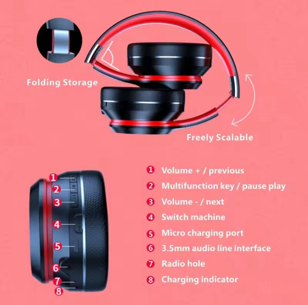 Wireless Over-Ear Bluetooth Headphones with LED Stereo Sound and Noise Cancellation in Black