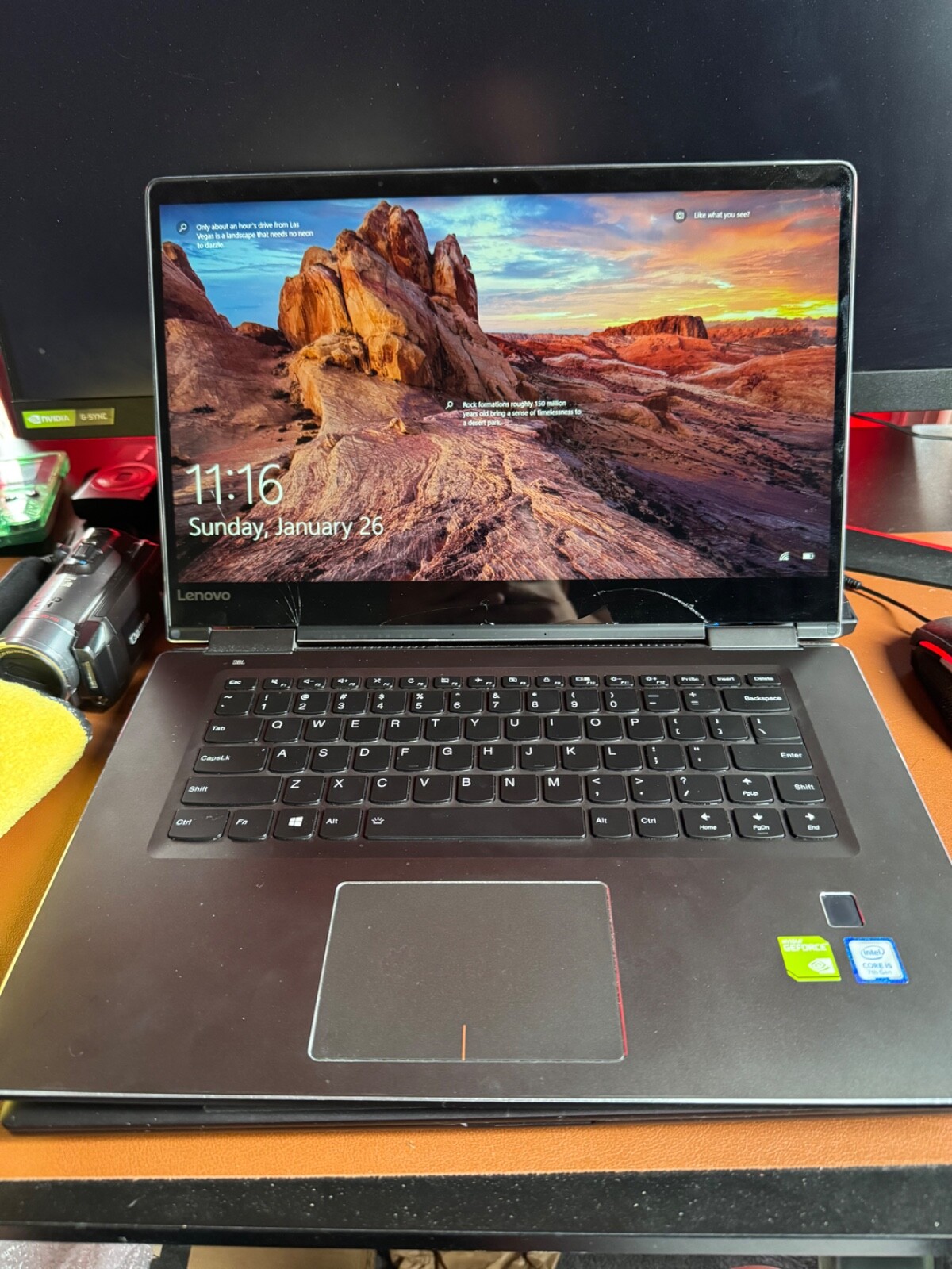The Lenovo Yoga 710-15IKB is a 15.6" notebook/laptop from the Yoga series, released in 2018. It features an i5-7200U processor with a speed of 2.50 GHz, 8 GB of RAM, and a 256 GB SSD for storage. The laptop has a maximum resolution of 1920 x 1080 and operates on Windows 10 home. READ DESCRIPTION THE LAPTOP WORKS FINE THE ONLY ISSUE IS THE SCREEN HAS A CRACK THAT CAN BE SEEN CLEARLY ON THE PICTURES BUT STILL WORKS FINE WITHOUT MESSING WITH THE RESOLUTION IM GIVING A PAIR OF AIRPODS WITH LAPTOP IF YOU HAVE ANY QUESTIONS FEEL FREE TO MESSAGE ME
