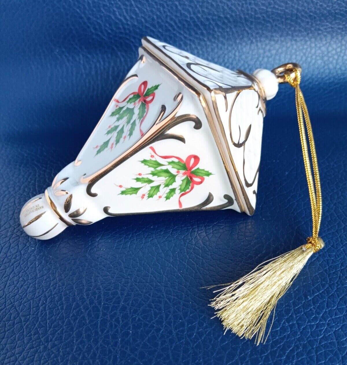 Lenox 2018 Annual Christmas Lantern Ornament Porcelian Ceramic In Box. I s crafted of hand painted ivory fine china, accented with gold. The Ornament bears the Lenox hallmark. It is about 4 inches tall. Consists of "Gold Like" Strand Tassel Box - worn at corners, scotch tape holds one side edge in back (see picture) Ornament in GREAT condition but date tags is loose (included in box)