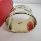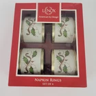 This is a nice set of Lenox (American by Design) Napkin rings featuring Holly, berries, and ribbon on a solid Oval napkin ring. The napkin rings measure 1 5/8" wide, 1 5/8" tall, and 2" long. The box has some damage, especially to the back so please take a look at all the pictures for details.