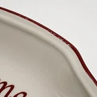 The Lenox American Winter Greetings "Bless This Home" 11-inch Oval Platter is made of porcelain and features a Beige color with a glossy finish. It has a Holiday Cardinals theme and a printed backstamp. This platter is part of the Winter Greetings product line by Lenox and is dishwasher safe. Measuring 11 inches in length, 7.25 inches in width, and 1.25 inches in height, this oval platter has one compartment and weighs 2 lbs. It is a charming piece for serving and displaying during the winter season. Lenox American by Design Winter Greetings, Bless This Home 11” platter with a beautiful red cardinal sitting among a holly, pine cone and ribbon background. Red trim has minor wear as indicated in photos. Beautiful accent piece for serving appetizers, decorating, or gift giving.