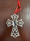 Add some sparkle to your Christmas tree with this Lenox Bejeweled Cross Silverplated Crystal Ornament. The ornament features a beautiful cross shape adorned with a shimmering crystal, making it a perfect addition to your ornament collection. This original piece comes in its original packaging and is sure to impress. Crafted with high-quality materials, this ornament is not only stunning but also durable. Measuring 3.5 inches in length and 4.75 inches in height.