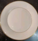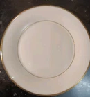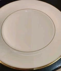 The Lenox Eternal White Dinner Plates are a set of vintage bone china plates manufactured in America in 1960. These round plates feature a Mid-Century Modern style with a glossy finish and a decorative gold trim around the rim. Each plate has a diameter of 10.5 inches and is part of the limited edition Eternal product line by Lenox. Suitable for various occasions, these elegant dinner plates showcase a timeless white color and a printed backstamp indicating their originality from the mid-20th century.