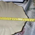 This beautiful Lenox centerpiece bowl is a stunning piece of art pottery from the Symphony product line. The scalloped pattern and glossy finish make it look like a vintage piece from the 1990s, but it was actually made in the United States. The bowl is made of porcelain and has a printed backstamp. Measuring 10.75 inches in length, 7 inches in width, and 3 inches in height, this bowl is the perfect size for any room. It has a contemporary style and can be used as a vase, candy dish, or to hold nuts and other small items. The 24k gold trim adds a touch of elegance to this center piece.