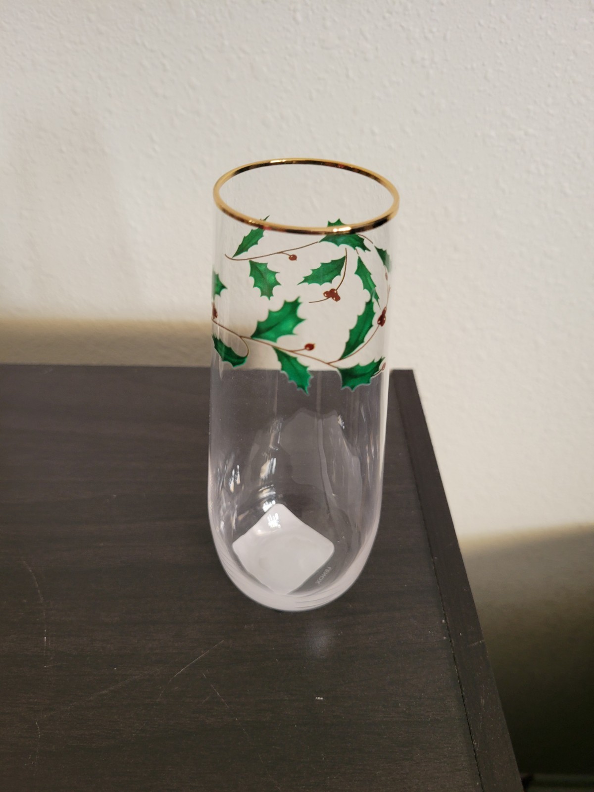 The NWT Lenox Holiday Stemless Champagne Flutes are a set of four elegant glass flutes specifically designed for the Christmas season. Made of clear glass, these champagne saucers are decorated with a classic holiday theme, making them perfect for an adult's champagne toast during celebrations. With a stemless design, these flutes offer a modern and stylish option for enjoying your favorite bubbly in a festive manner. Made by the reputable brand Lenox in China, these champagne flutes are sure to add a touch of sophistication to any holiday gathering.