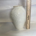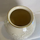 Color: Ivory & Gold Signed: No Care Instructions: Clean with Warm Water Handmade: No Country of Origin: United States Finish: Glossy Glassmaking Technique: Hand Blown Theme: Flowers - Iris Subject: Flowers Brand: Lenox Pattern: Floral Item Height: 7 in Original/Reproduction: Original Material: Porcelain Size: Medium Era: Late 20th Century (1970-1999) Time Period Manufactured: 2000 Item Length: 8 in Antique: Yes Occasion: All Occasions Type: Vase California Prop 65 Warning: n/a Department: Adults Number in Pack: 1 Features: Embossing, Relief Style: Contemporary Shape: Round