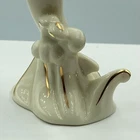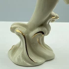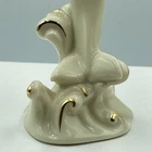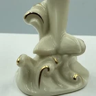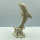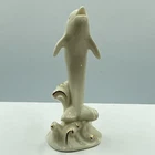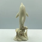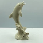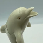 The Lenox Porcelain Dolphin Figurine is a small sculpture made of porcelain with 24K gold trim. It features a gold and ivory color scheme, standing at 4 inches in height and 2 3/4 inches in length. The figurine depicts a dolphin in a nautical style, part of the Animals collection by Lenox. This hand-crafted piece is a charming addition to any decor with its elegant design and fish subject.