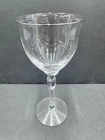 The Lenox Rhythm Platinum Water Goblet Glass is a vintage hand-blown piece from 1991, made in the USA. This elegant goblet features a contemporary style with a round shape and a twist stem etched with platinum trim. It has a 12 oz capacity and stands at 8.5" tall, making it suitable for various occasions. The swirl optic pattern adds a touch of sophistication to the glossy finish, making it a stylish addition to any drinkware collection.