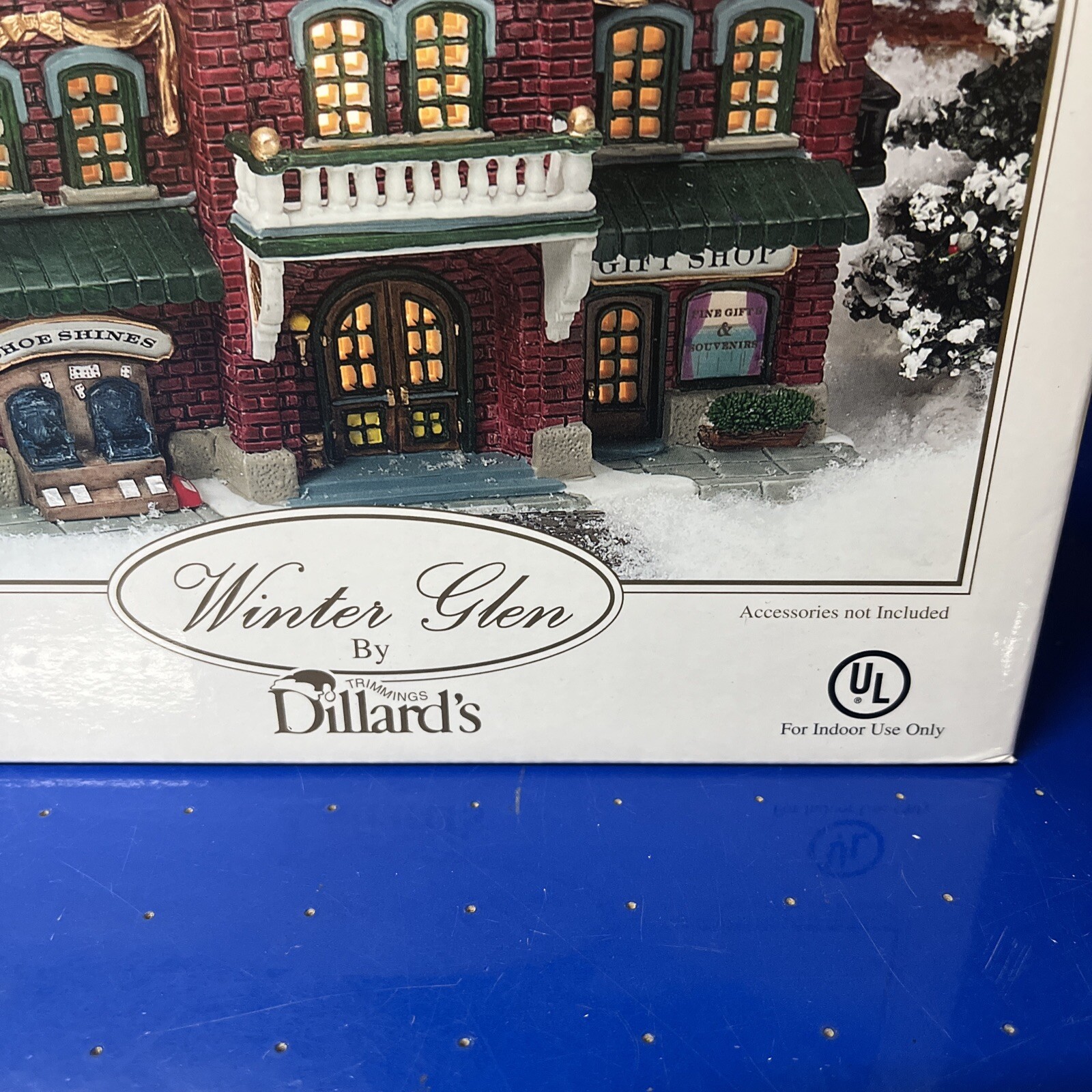 The Lenox Winter Glen Christmas "Winter Glen Hotel" is a ceramic and porcelain collectible from the Lemax brand. This piece is part of the Winter Glen collection and features a charming Winter scene, perfect for the holiday season. Although the product does not include any lights, it is still a beautifully crafted addition to any Christmas village display. The intricate details and high-quality materials make this piece a valuable and festive addition to any holiday decor collection.