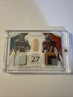 The product is a 2018 Panini Immaculate sports trading card featuring NFL players Leonard Fournette and Ronald Jones II. The card has a patch with a jersey number design, limited to 44 out of 50. It includes memorabilia from the Jacksonville Jaguars and Tampa Bay Buccaneers players, making it a rare and collectible item for football fans.