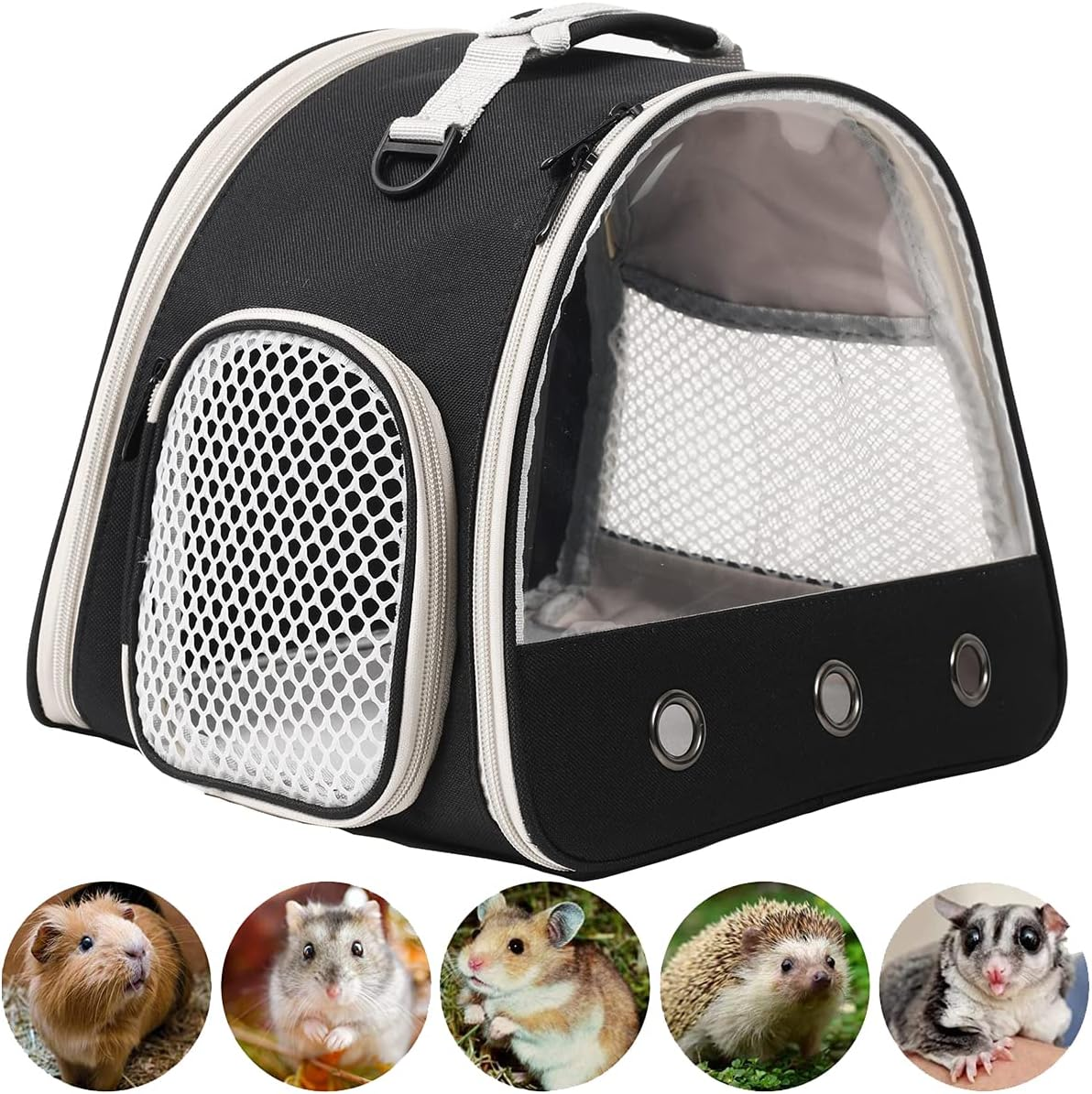 Unique Small Animal Travel Set:The bearded dragon carrier with leather harness leash set make it more convenient for taking your cute go out for hiking,shopping,camping and vet,the uapdate design is great for lizard,bearded dragon,guinea pig and other small animal Veatilation & Comfortable: This reptile small animal carrier has 3 vent in front and a bite resistant ventilation net on the side ensuring fresh air and airflow,the larger interior space allows your pet to move freely inside 3 SIZE PACKS Lizard harness leash,Our bearded dragon harness comes with small, medium and Large 3 size leather harness leash, can be used for different age of your reptiles, from baby, juvenile to adult beardied. The guinea pig carrier with bearded dragon harness leash,besides the adjustable harness, we also offer you three different sizes S, M, L in each set, offers a snug fit and reliable security, giving you peace of mind during outdoor adventures. Convenient to use: the hamster carrier with a adjustable shoulder strap and a soft handle on the top,you can carry the small animal carrier by hand or shoulder,bunny travel bag equipped with a soft mat has a side pocket for store pet snacks or water cups allowing pets to travel long distances without thirst.It is very convenient for you to use it to take pets on trips Product Description Bearded Dragon carrier Harness and Leash Set 2023 new release Bearded Dragon carrier with Harness and Leash Set ,besides the adjustable harness, we also offer you three different sizes S, M, L in each set.Specially designed for reptile like lizard,chameleon and other small animal such as guinea pig,rabbits, hamsters,sugar glider Our bearded dragon harness comes with small, medium and Large 3 size leather harness leash, can be used for different age of your reptiles, from baby, juvenile to adult beardied,You just need to adjust clip on the rope,the harness can be tightened to be suitable for the shape of other small pets. Bearded Dragon Travel Carrier Pet-safe Material, clear front window features a transparent view surrounding the hamster backpack carrier, protect small pets from bugs,the small animal backpack carrier has a high quality transparent front window design, to keep a broad vision for your loved pets. Guinea Pig Carrier Small Animal Backpack for KIDS Small Animal Travel Carrier, Small Reptile Travel Carrier,Bearded Dragon portable carrier, good for two guinea pig, rat, bearded dragon, small bunny and small birds like parrot parakeet,leopard geckoetc. Breathable & Comfortable : This small animal carrier has a larger interior space, with a bite resistant ventilation net on both side and three ventilation holes on the front, ensuring fresh air and airflow for fur children without worrying about suffocating The video showcases the product in use. The video guides you through product setup. The video compares multiple products. The video shows the product being unpacked. The Hamster Travel Carrier Particulars 1 side open window updated soft pandded pandle 3 vent holes (diameter is 0.75”) to feature ventilation and easy to feed snacks via holes A removable soft washable mat and adjustable shoulder strap are included The Harness Leash Particulars Lizard Harness Leash is made of soft synthetic leather and durable nylon rope,the velvet backing has super soft and warm touch to reptile and lizard 3 SIZE PACKS Bearded Dragon Leashes suit for different shapes of your reptiles 360° Rotatable clip allow your pet to spin around freely