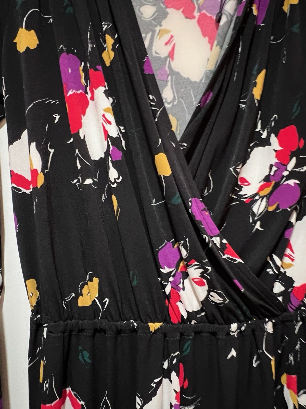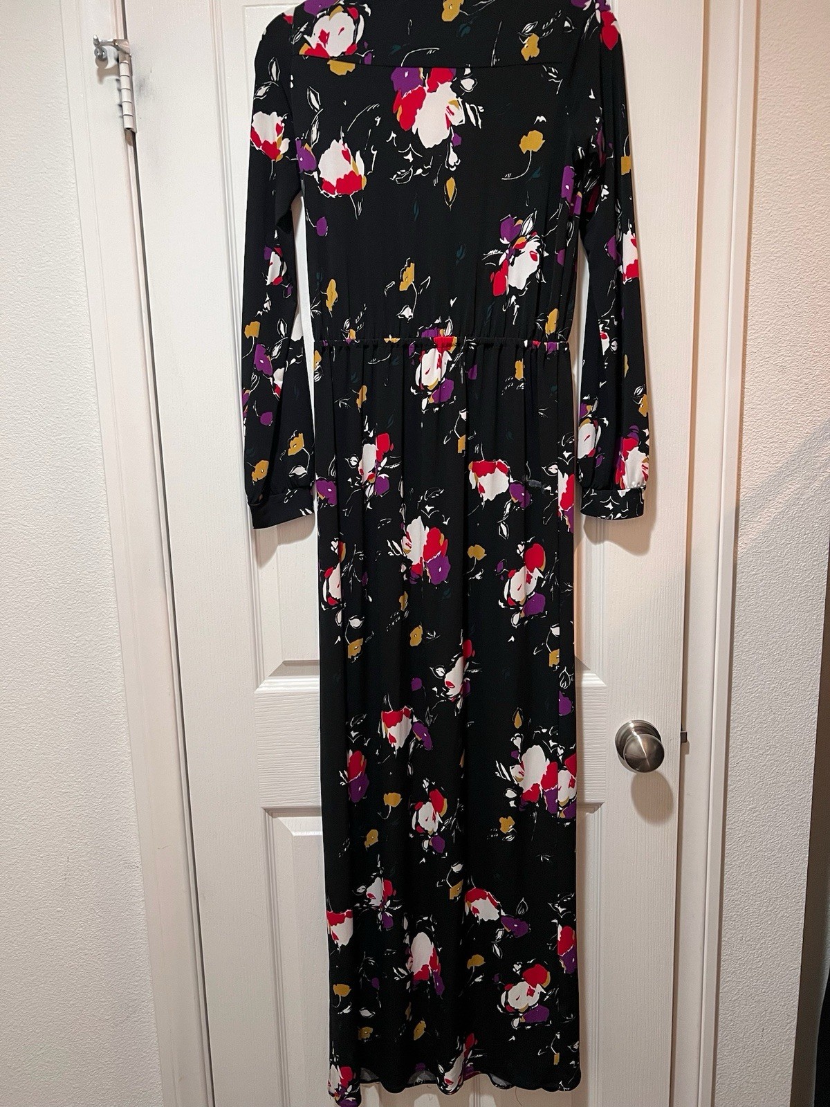 The Leota Black Floral Printed Maxi Dress in size XS is a stylish and versatile travel dress that is wrinkle-resistant, making it perfect for on-the-go adventures. Featuring long sleeves and a long dress length, this dress is both comfortable and elegant. The black floral print adds a touch of femininity to the classic maxi dress style, making it a must-have for any woman's wardrobe. Bin D