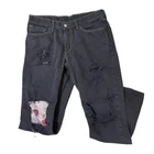 Unique pair of upcycled Levi's Womens Jeans with Patches and heavy distressing! Levi & Strauss Co Jeans Dark Navy Floral patch Rips for a destroyed look! Measurements approximate in inches taken flat: Waist 17/Rise 9.5/Inseam 29.5 Ships same or next day! Bundle for best savings! Thank you for shopping with me!