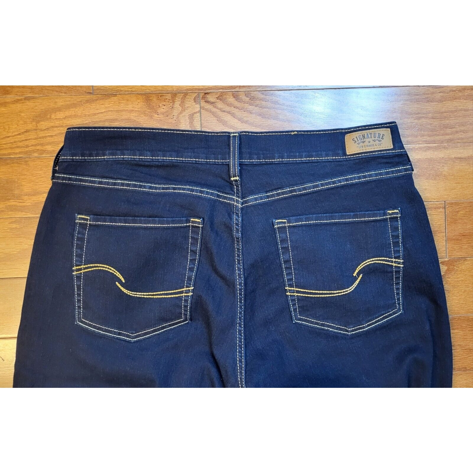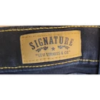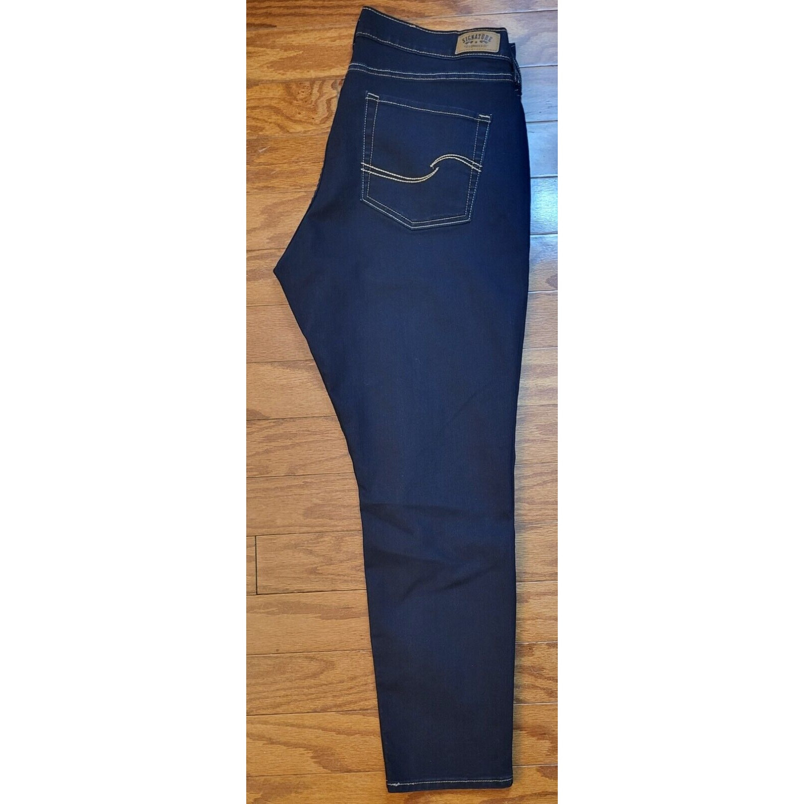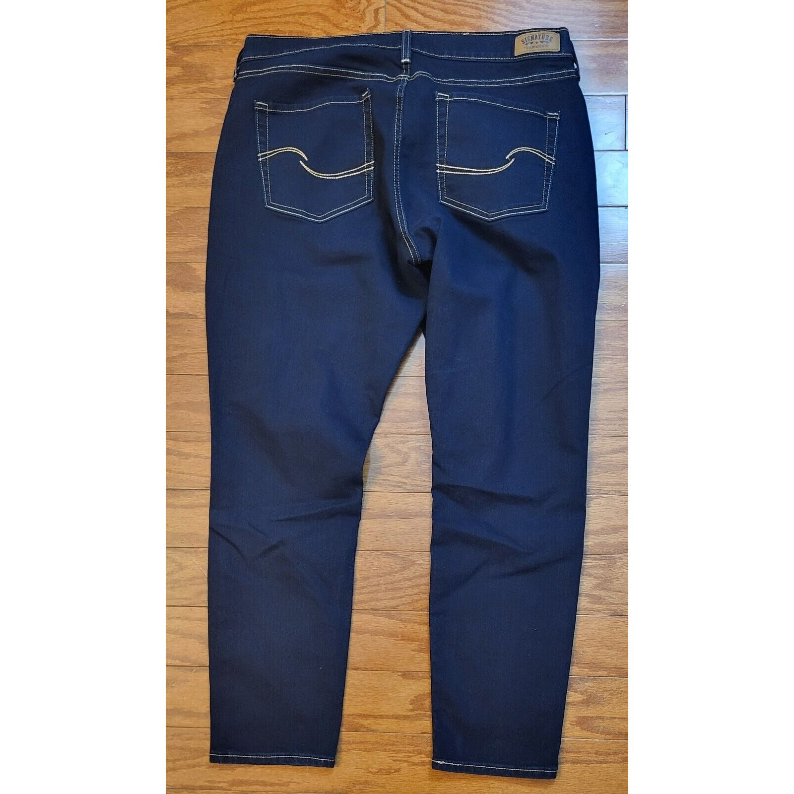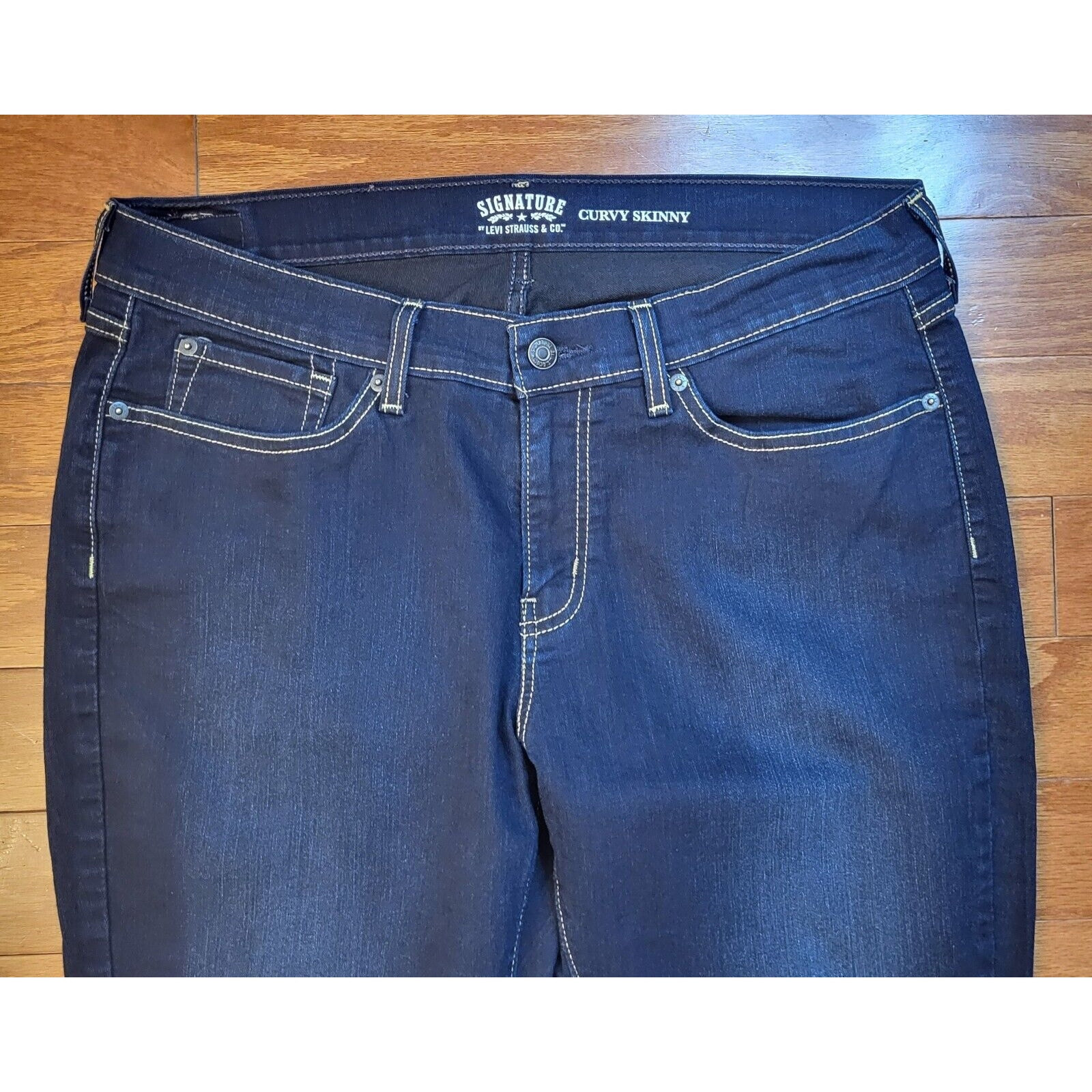 Elevate your denim game with these Levi's Signature Women's Jeans in size 16. The mid-rise, curvy skinny fit is perfect for any modern wardrobe, while the dark wash accents add a touch of edgy style. The 5-pocket design, complete with button and Levi's logo accents, provides ample storage space for your essentials. Crafted from a blend of polyester, cotton, and cotton blend fabrics, these jeans are both comfortable and stretchy, making them perfect for any season. The zip closure and ankle length add to the sleek, modern look. Machine washable for easy care, these jeans are a must-have addition to any denim collection. Waist 36 in Inseam 28 in Mid Rise 9 in Excellent pre-owned condition. Look likes new! Add them to your wardrobe today!