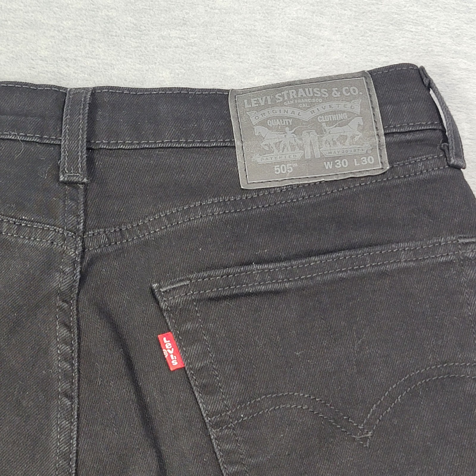 The product is a pair of Levi's 505 Men's Jeans in size 30x30, featuring a classic fit with a straight leg style. Made from black denim with a solid pattern and a mid-rise waist, these jeans are crafted from 100% cotton fabric. The zip closure and regular fit make them comfortable for casual wear, perfect for skateboarding or everyday tasks. The Levi's 505 model is part of the 500 Series product line, known for its timeless style and quality construction.