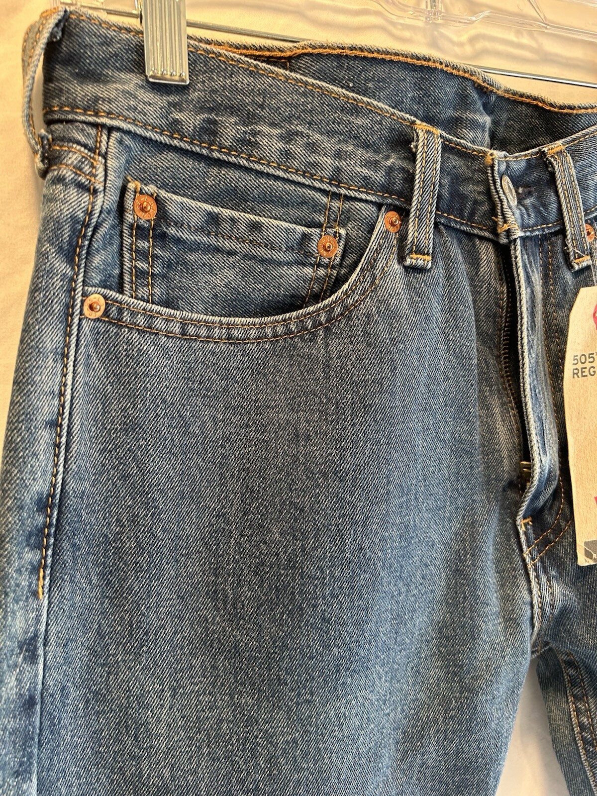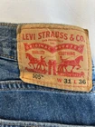 Levi's 505 Men's Regular Fit Jeans in size 31x36 feature a classic straight style in blue denim. They have a mid-rise and come with button and zipper accents, belt loops, and pockets. The jeans are from the Levi's 500 Series, with a solid pattern and a medium fabric wash. Suitable for both men and women, they are ideal for all seasons and can be machine washed.
