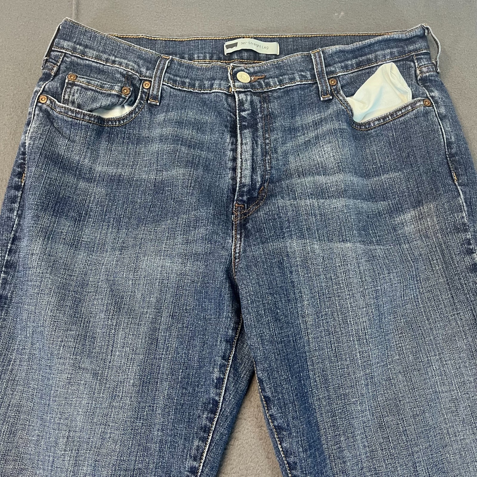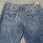 The product is a pair of Levi's 505 women's jeans in size 16, featuring a blue denim fabric with a faded wash. These straight leg jeans have a mid-rise waist and a 5-pocket design, with a zip and button closure. Made of a cotton and spandex blend, the jeans are machine washable and suitable for all seasons. They are part of the Levi's 500 Series, with a vintage-inspired 90s theme. This classic pair of jeans from Levi's is both stylish and comfortable for everyday wear.