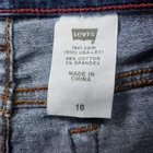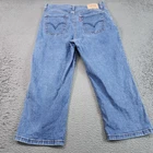 Brand: Levi's Style: Womens Levi's 512 Perfectly Slimming Capri jeans with classic five-pocket denim styling. Color: Blue medium wash denim. Size: Womens 10 as indicated on the interior woven size tag. Materials: 98% cotton, 2% spandex stretch denim fabric. Design details: Mid rise waist with belt loops, zip fly with metal button closure, front scoop pockets with rivet details and coin pocket, and back patch pockets with signature arcuate stitching in a capri-length straight leg silhouette. Features: Stretch denim construction for comfort and ease of movement, Levi's 512 Perfectly Slimming design intended to flatter through the seat and thigh, and versatile cropped length suitable for warm weather casual outfits. Additional info: Interior label reads Perfectly Slimming Capri 512 from the Levi's 500 Series with Levi's branding; back waistband features the classic Levi Strauss & Co. two-horse leather logo patch and red tab at the rear pocket, and care tag notes fabrication of 98% cotton/2% spandex and Made in China.