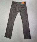 Levi's 514 Jeans in black, size 32 waist and 34 inseam, feature a slim, straight leg fit with low rise. Made of denim with a stretch fabric, these men's jeans from the Levi's 500 Series collection are ideal for skateboarding. The closure is a zip, and the brand is Levi's.