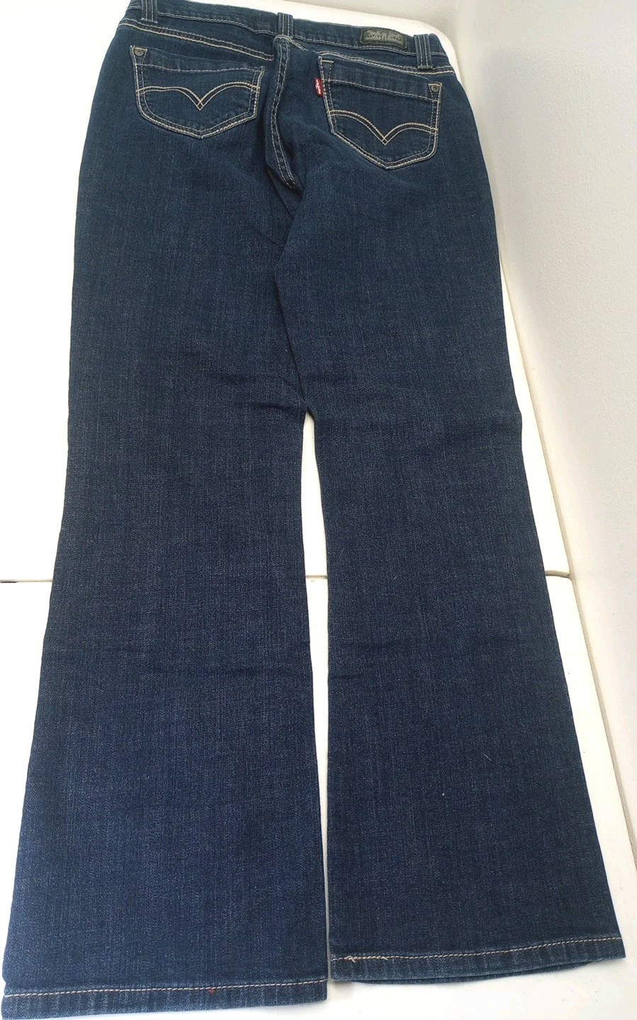 The product is a pair of Levi's 529 Curvy Boot Cut Jeans in a medium wash denim, featuring a mid-rise fit for women in size 10 with a waist size of 30 inches. These classic jeans are made of a blend of spandex and cotton, offering a comfortable and stretchy fabric for a curvy fit. The jeans have a zip and button closure, along with accents like logo detailing and pockets, making them a stylish and versatile option for any season.