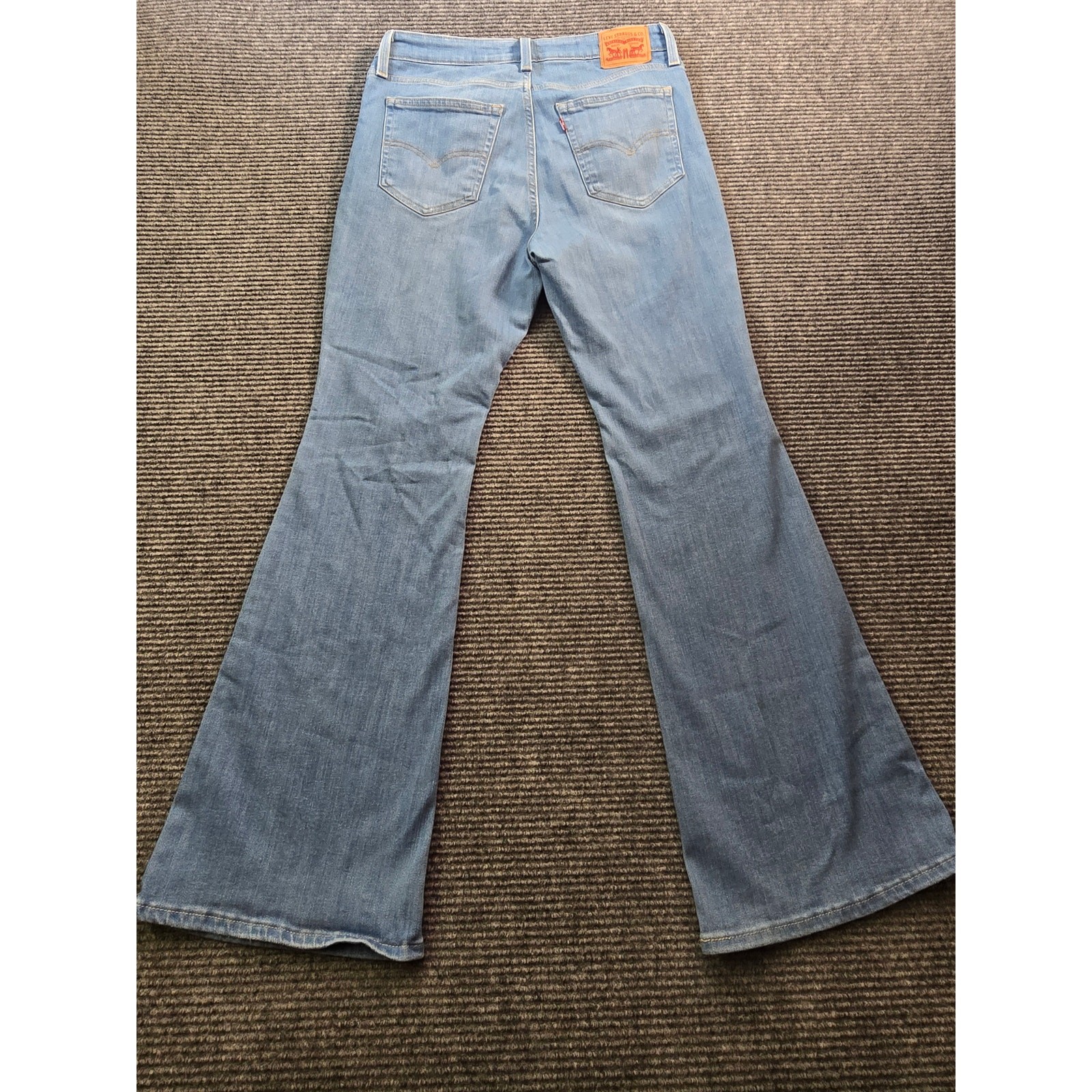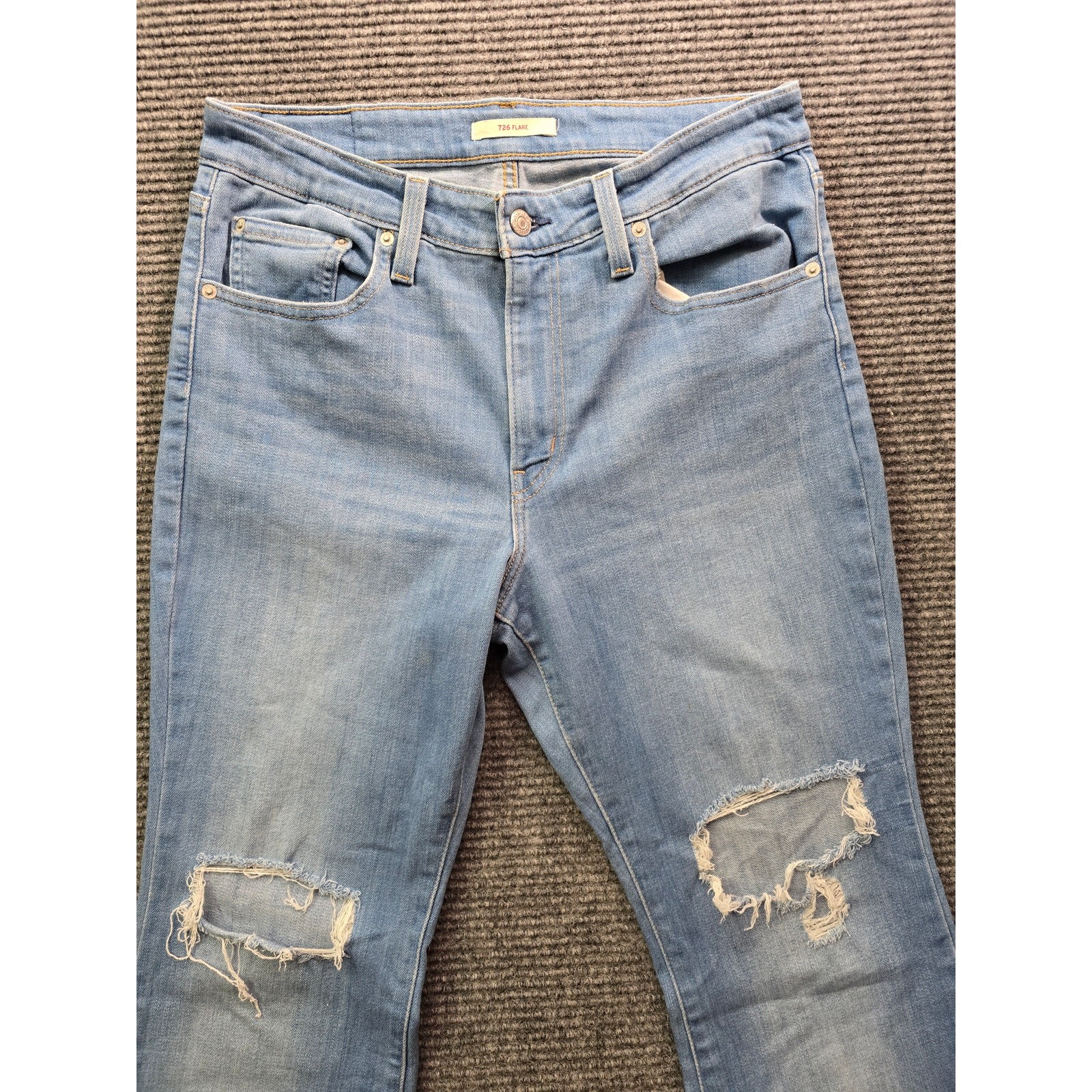 Classic Levi’s 726 flare jeans with a flattering fitted thigh and wide leg opening. Medium blue wash with intentional distressed knees for a worn-in, casual look—easy to dress up with boots or keep laid-back with sneakers. Great everyday denim with a timeless silhouette. Color may vary slightly from photos due to lighting and monitor settings. Details: Brand/Model: Levi’s 726 Style: Flare Color/Wash: Medium Blue Size: Tag removed 30x32 Fabric: Tag removed Made in: Tag removed Condition: Good pre-owned condition; distressed knees are intentional, light general wear Key Note: Flared leg, classic 5-pocket styling Measurements: Waist: ~15" flat (30" total) Inseam: ~32"