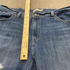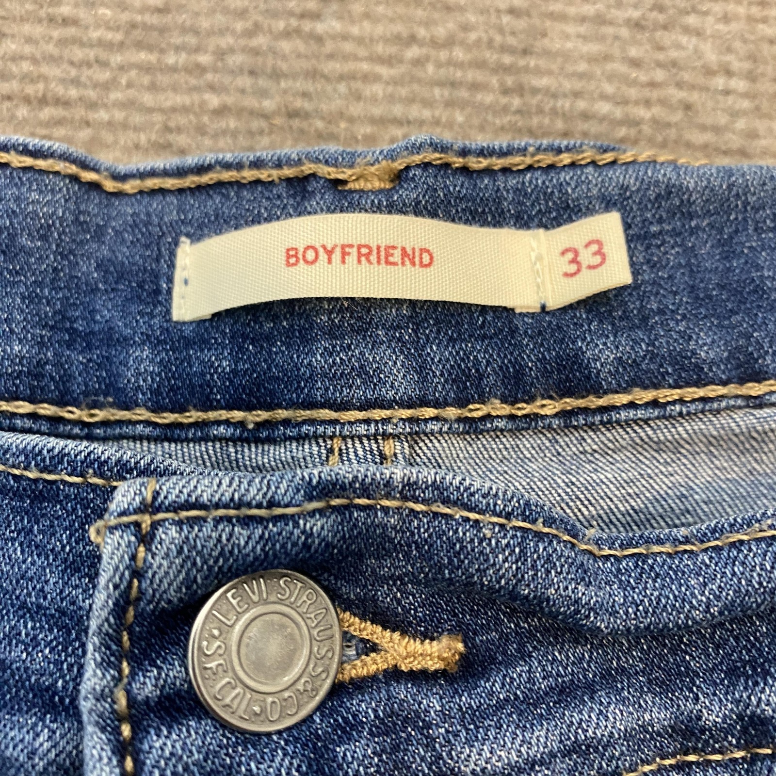 Levis Boyfriend Jeans Womens 33 Blue Distressed Denim Relaxed Fit Mid Rise 27L Condition: Good used condition — visible signs of wear, featuring intentional distressing and rips on the front thighs as shown. No missing buttons or major defects beyond the designed flaws. Material: 60% cotton, 23% viscose, 16% polyester, 1% elastane Style: Boyfriend, relaxed fit with a straight leg and a mid-rise Denim features intentional faded wash and distressed/ripped detailing on both legs for trendy, casual look Classic five-pocket styling with Levi Strauss & Co. branded button and back patch Color: Blue Great pair of casual, comfortable jeans perfect for weekend wear