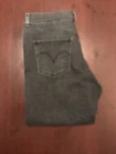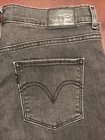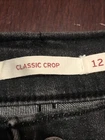 Levis Classic Crop in Comfy Stretch Cotton Blend Size 12 with Black Studded Slit Details - Charcoal Gray Denim Jeans. The 3 1/2” slit at hem forms a small kick flare effect. Excellent condition with no other than one white thread more exposed than the rest as shown in photo on back of leg: Waist 17” Hip 19 1/4” Rise 10 1/2” Inseam 24 1/2”